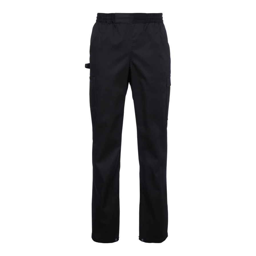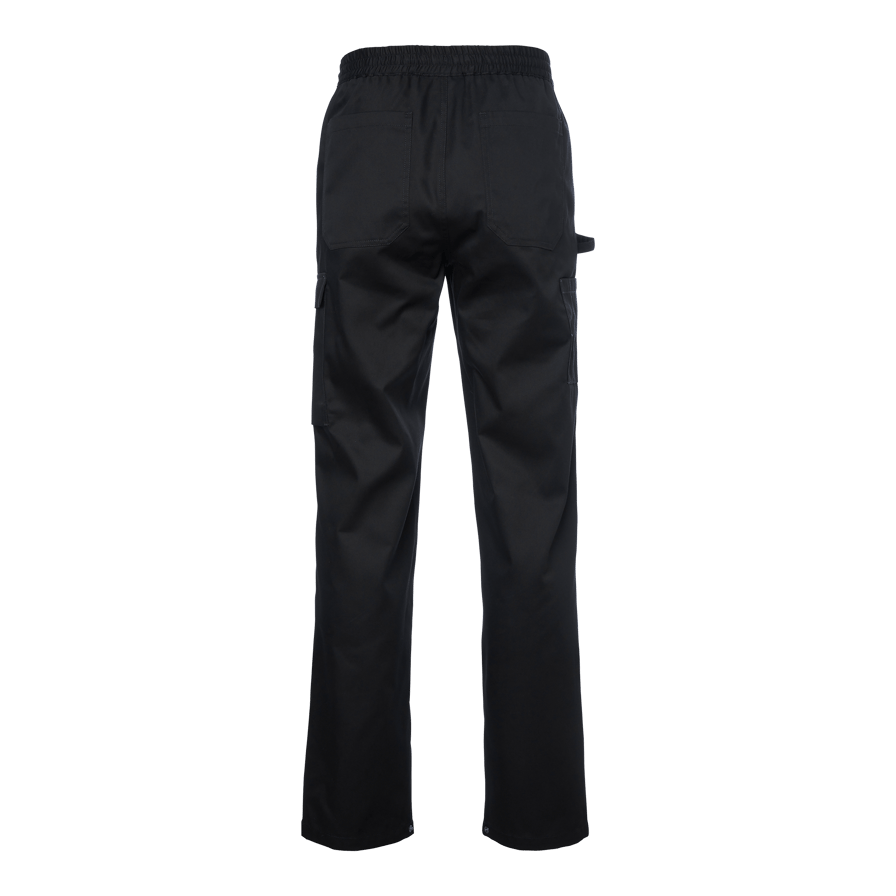 Emir Chef’s Trousers are a roomy unisex model with an elastic waistband and drawstring. The chef’s trousers feature slanted front pockets, a right leg pocket with a flap, a tweezer pocket with a loop on the left leg, and back pockets. The trousers have adjustable leg openings with snap buttons.