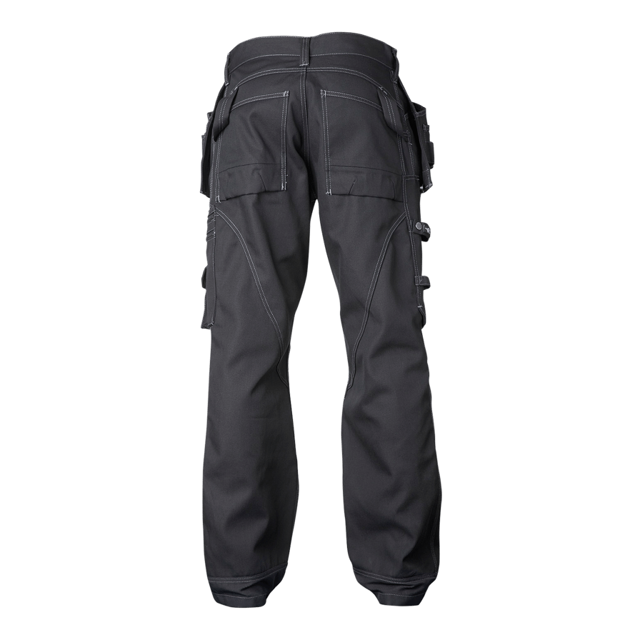Two reinforced hanging pockets. Left with extra pocket. Right with three smaller pockets and loops for tools. Two large front pockets. Rule pocket with room for two knives. Leg pocket with zips. Phone pocket. ID pocket. Hammer hanger x 2. Two reinforced back pockets. Reinforcements in ankles. S-structure knee pockets. Knee protection can be positioned at two levels. Articulated legs