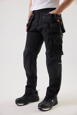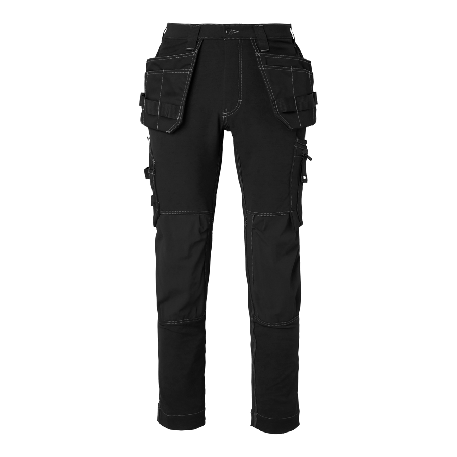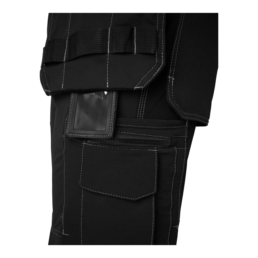 Craftsman trousers in 4-way stretch with pre-curved legs and Cordura® knee pockets. Two front pockets, reinforced back pockets, loose hanging nail pockets with extra compartments, zippered leg pocket and reflective detail at the back. Ideal for demanding work environments.