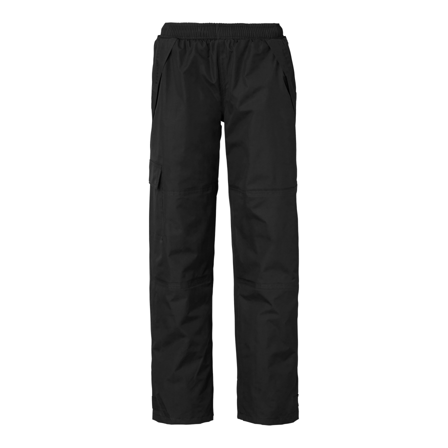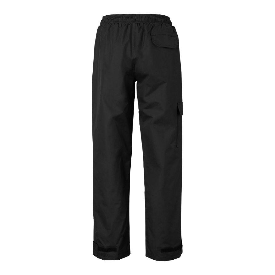 Wind and waterproof pants with taped seams and good breathability. Elastic and drawstring waist, two side pockets, one leg pocket with flap and adjustable leg end with Velcro.