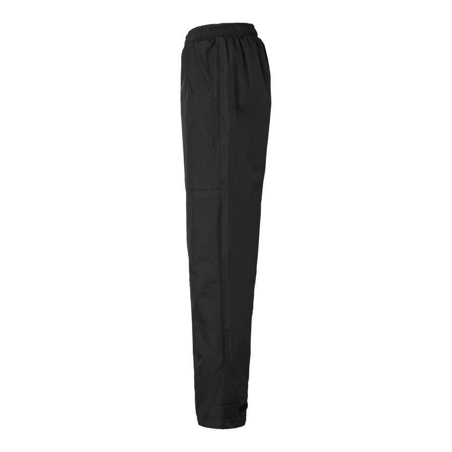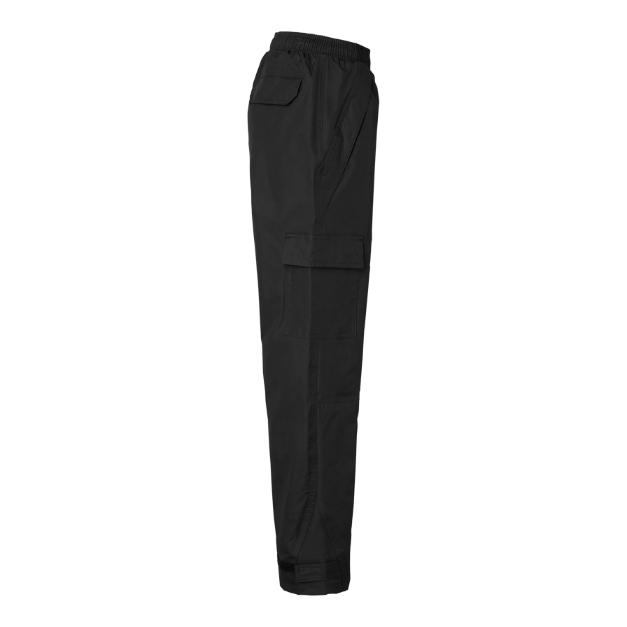 Wind and waterproof pants with taped seams and good breathability. Elastic and drawstring waist, two side pockets, one leg pocket with flap and adjustable leg end with Velcro.