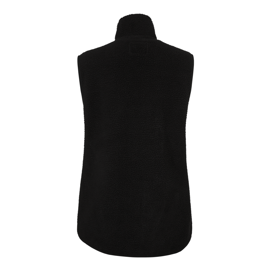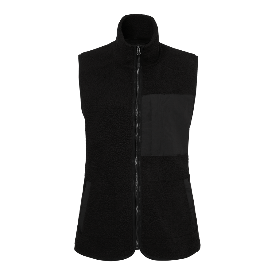 Sherpa fleece vest in a close-fitting vapor fit with soft inside and fluffy outside. Equipped with two side pockets, welt pockets and a zippered chest pocket. Black woven sections, rounded hem at the back and discreet SW tape at the end of the garment.