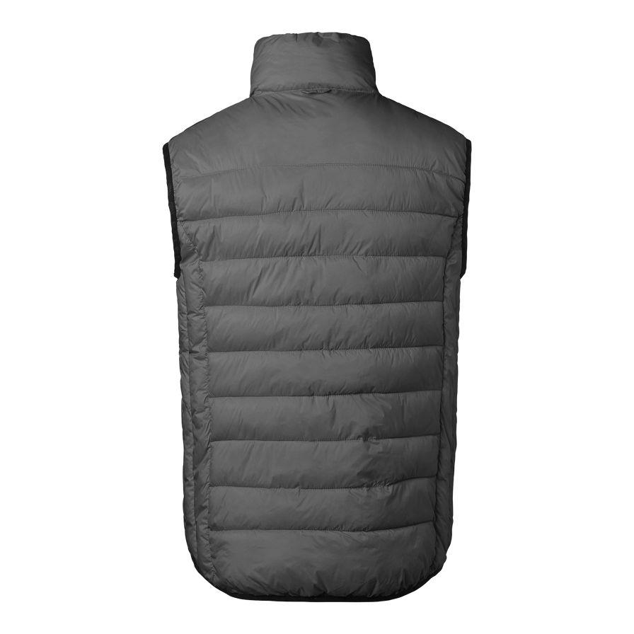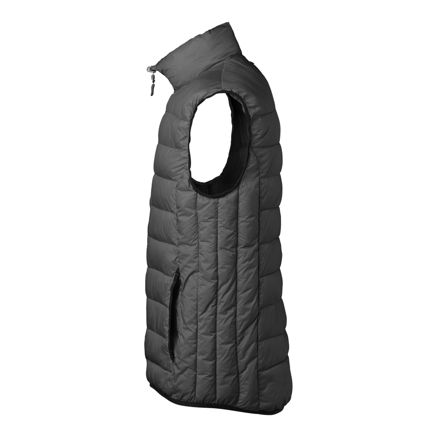 Lightweight vest with faux down and a close fit. Can be used alone or attached to the Ames shell jacket as a warm torso liner. Narrow channels keep the down in place. Two side pockets. Elastic bands at hem and armholes.