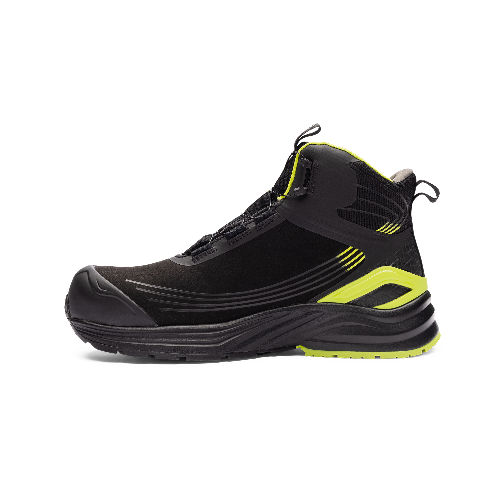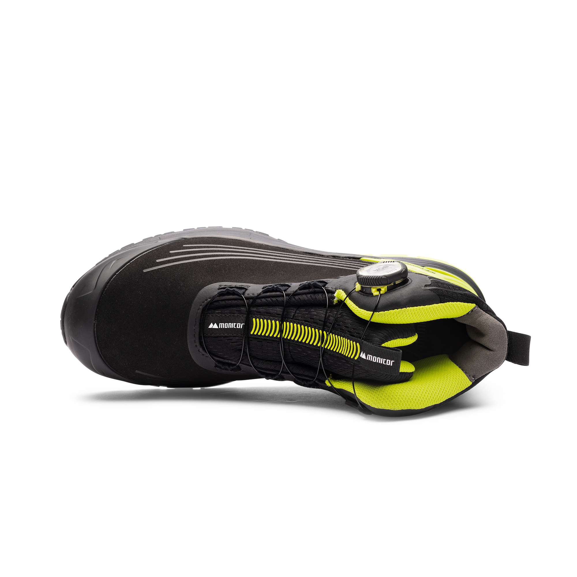Experience the next generation of safety shoes. The ICE - Evolution Vision from Monitor is the ultimate safety shoe designed to offer maximum comfort and safety. The shoe is equipped with an NFC chip from Quin that can store important information such as blood group and contact details of relatives. An independent mobile phone can be used to scan the chip in the shoe if you need to contact relatives or have more information for the emergency services in the event of a workplace-related accident. The safety shoe has a unique Monitor Return sole system consisting of TPU stabiliser, updated insole in Recycle Plus 2.0, midsole in Super Critical Foam that provides excellent cushioning and energy-returning properties, nail protection in APT textile and a TPU outsole. Stay comfortable all day with the microfibre upper and Monitor's new Equip Fit fit with a flexible last that adapts to the MNTR1 toe cap to prevent blisters. The smart lacing with BOA® Fit System L+1 makes it easy to adjust the fit quickly and precisely. The ICE Evolution Vision S7S is equipped with an HDry Bio membrane that is laminated to the upper, meaning the shoe is completely waterproof.