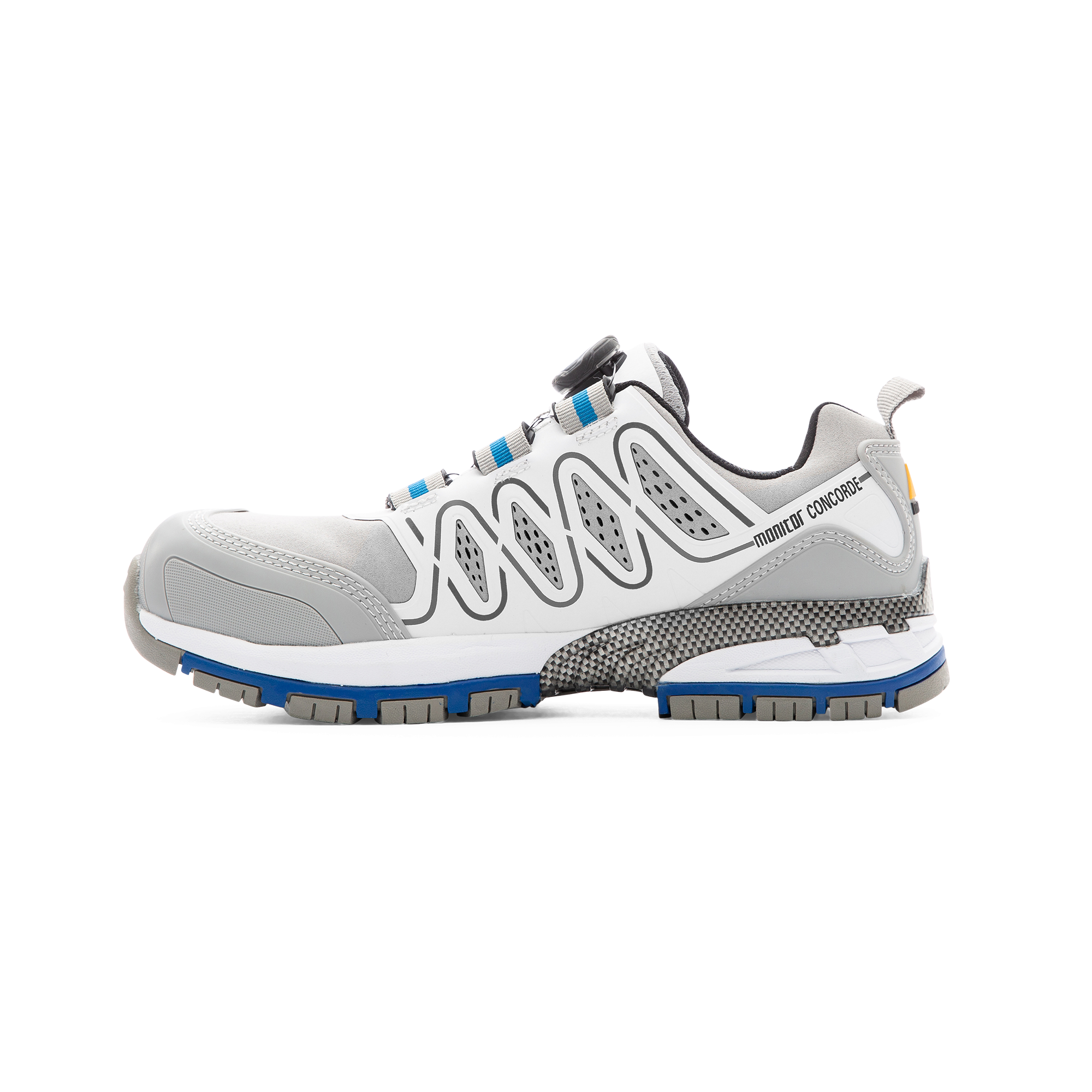 Discover the Monitor Concorde Safety Shoe, an innovative and sporty safety shoe that combines high safety with exceptional comfort and style for construction and industrial professionals. This safety shoe is designed to offer maximum protection and comfort throughout the working day. The upper is made from a combination of mesh and microfiber, providing excellent breathability and keeping your feet cool and comfortable. The highly breathable microfiber panels on the sides ensure optimal ventilation. The Monitor Concorde Safety Shoe is equipped with the innovative BOA® Fit System, which makes it easy to put on and take off the shoe and allows for quick and precise adjustment of the fit. The outsole is Monitor's new SIGMA sole, a further development of the classic Alpha sole, which provides excellent grip on most surfaces thanks to its patterned rubber. The midsole is made of cushioning EVA material and has a powerful torsion fork that further increases stability. The wide aluminum toe cap and Monitor's SS2.0 insole ensure maximum protection and support for your feet. This safety shoe is perfect for both men and women looking for a reliable and comfortable safety shoe with a sporty design at a competitive price. Choose the Monitor Concorde Safety Shoe to experience a combination of high safety, outstanding comfort and durability throughout your working day.