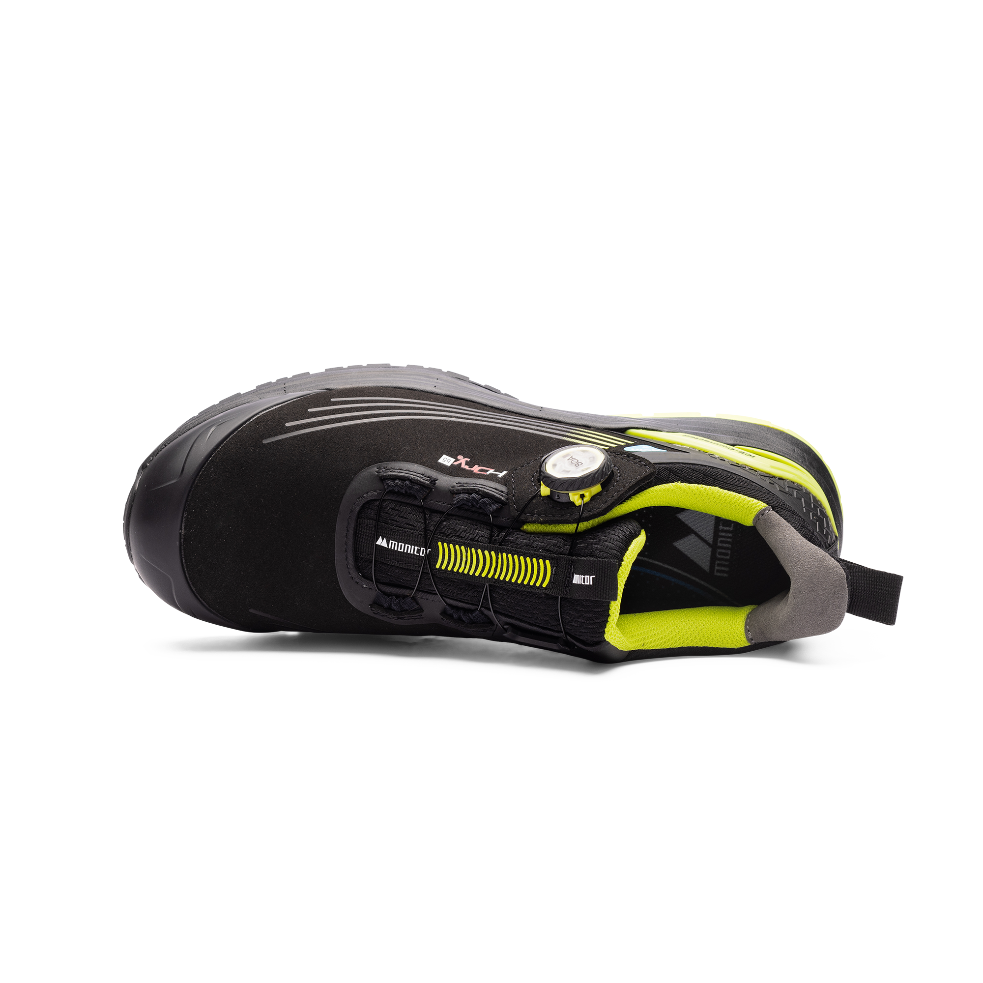 Advanced safety shoe equipped with an NFC chip from Quin and a unique M-Return sole system featuring a TPU outsole and a Super Critical Foam midsole for excellent cushioning. High comfort with Monitor's new Equip Fit design, which adapts to the MNTR1 toe cap. The Li2 BOA® Fit System and HDry Bio membrane make the shoe completely waterproof.