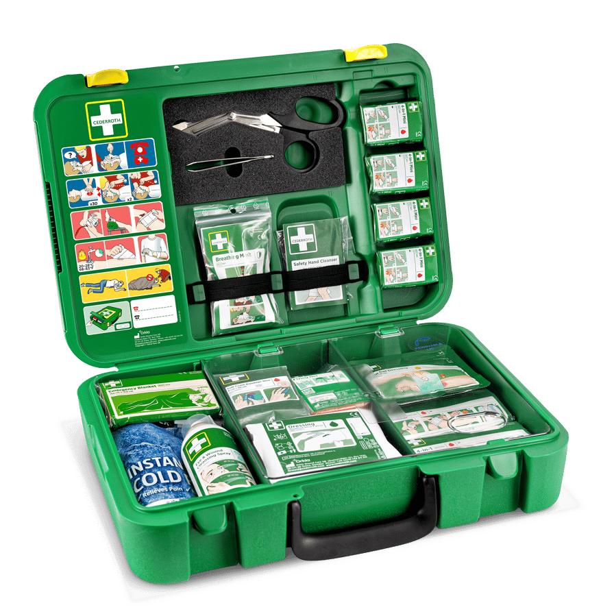 Kestävä kovamuovinen ensiapupakki, jossa laastarinannostelija. Kotelo suojaa iskuilta, pölyltä ja kosteudelta. Tuotteet kuten käsineet, sakset ja elvytyssuoja sisäkannessa. Punaiset tarrat ilmoittavat täydennystarpeesta. Kirkas näkyvä väritys. Tilaa omille tuotevalinnoille, kuten silmänhuuhtelulle.