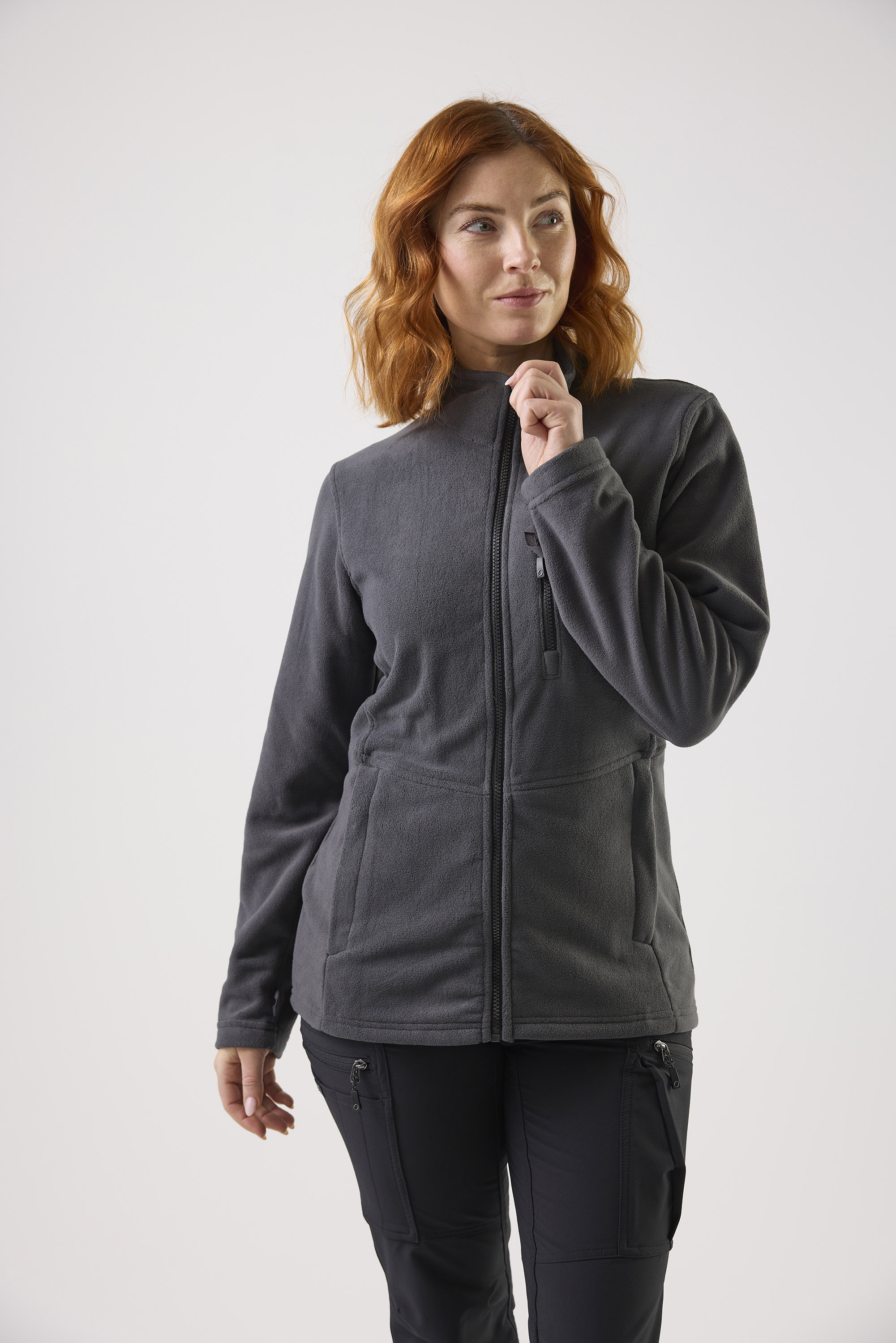 Fleecetakki, jossa on vartalonmyötäinen istuvuus ja jota voi käyttää yksin tai Alma-kuoritakkiin liitettynä. Varustettu kahdella sivutaskulla ja yhdellä rintataskulla, joissa on kontrastiväriset vetoketjut. Mukana vaihdettavat mustat vetoketjunvetimet.