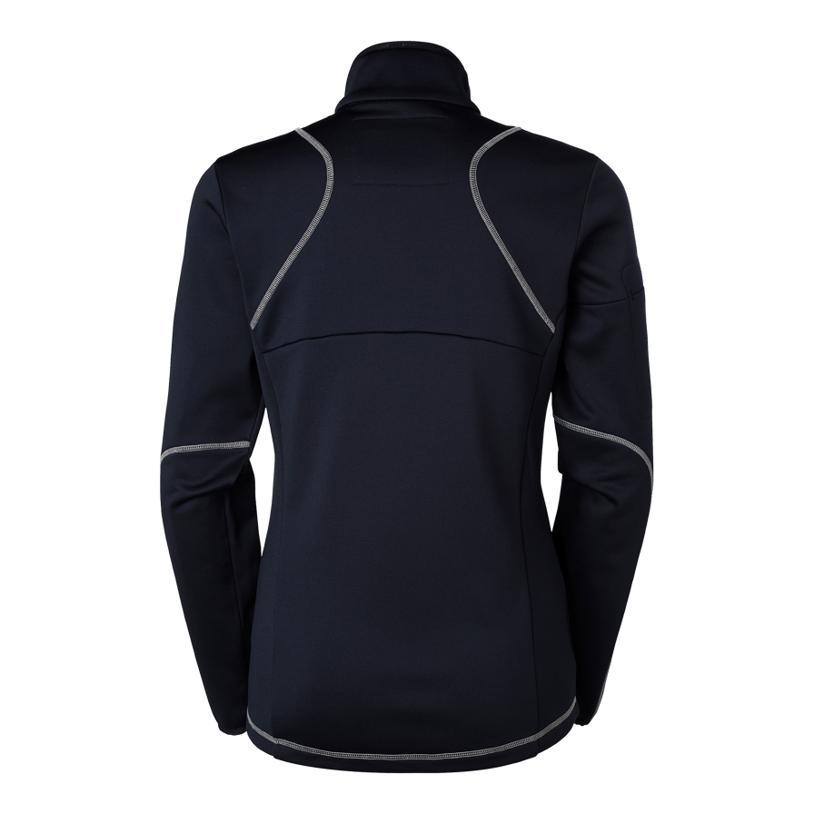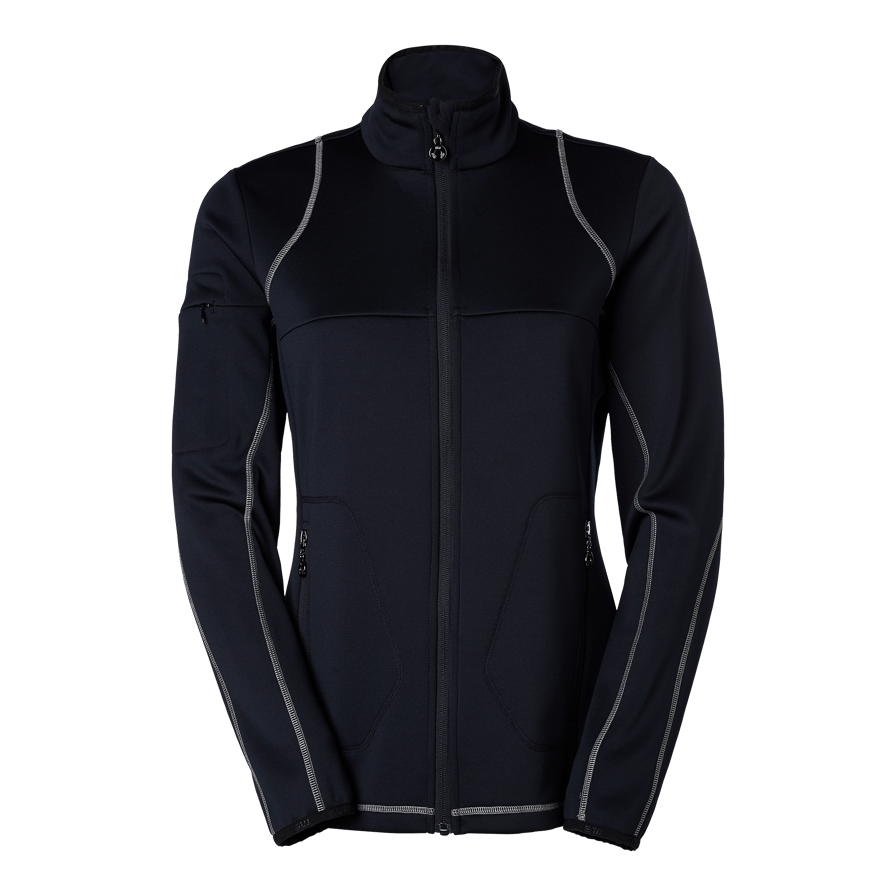 Power stretch -takki vartalonmyötäisellä istuvuudella. Kontrastiväriset joustavat reunusnauhat pääntiessä ja hihansuissa. Vetoketjulliset taskut ja yksityiskohtaiset tikkaukset. Oikeassa hihassa matkapuhelintasku, jossa on sisäpuolella aukko johdolle.