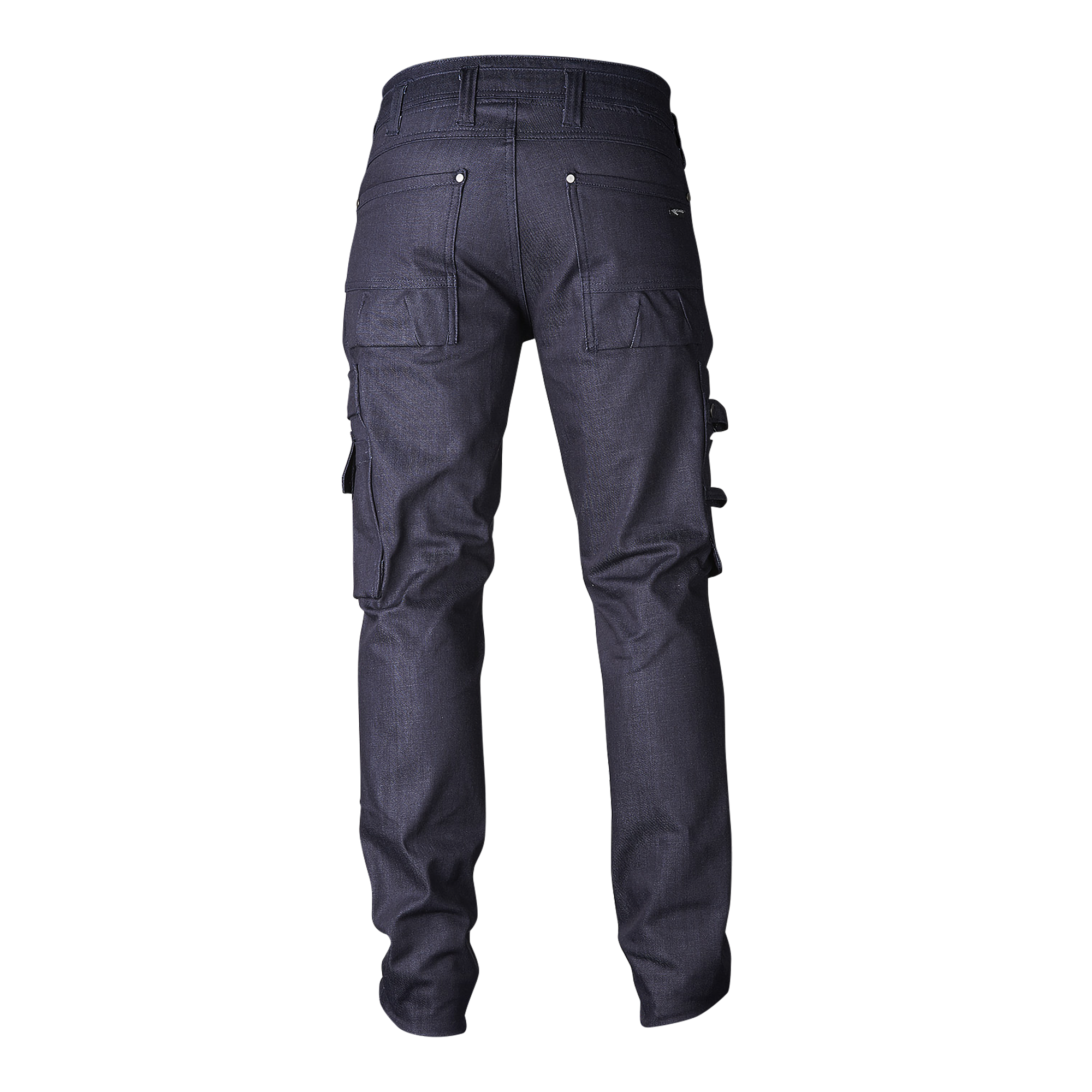 Kaksi etutaskua. Kaksi takataskua. Kaksi reisitaskua, yksi mittatasku. Puhelintasku.Kynäpidike. Muotoonommellut lahkeet.