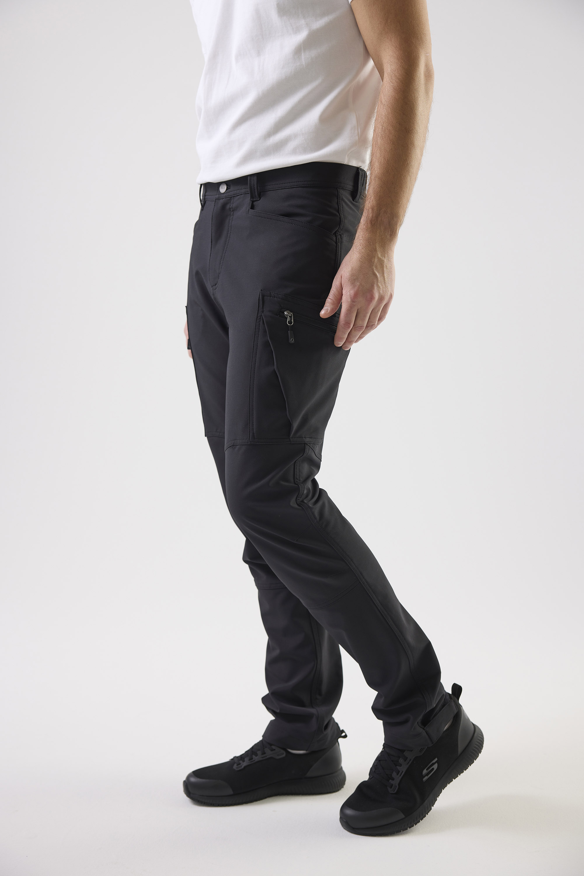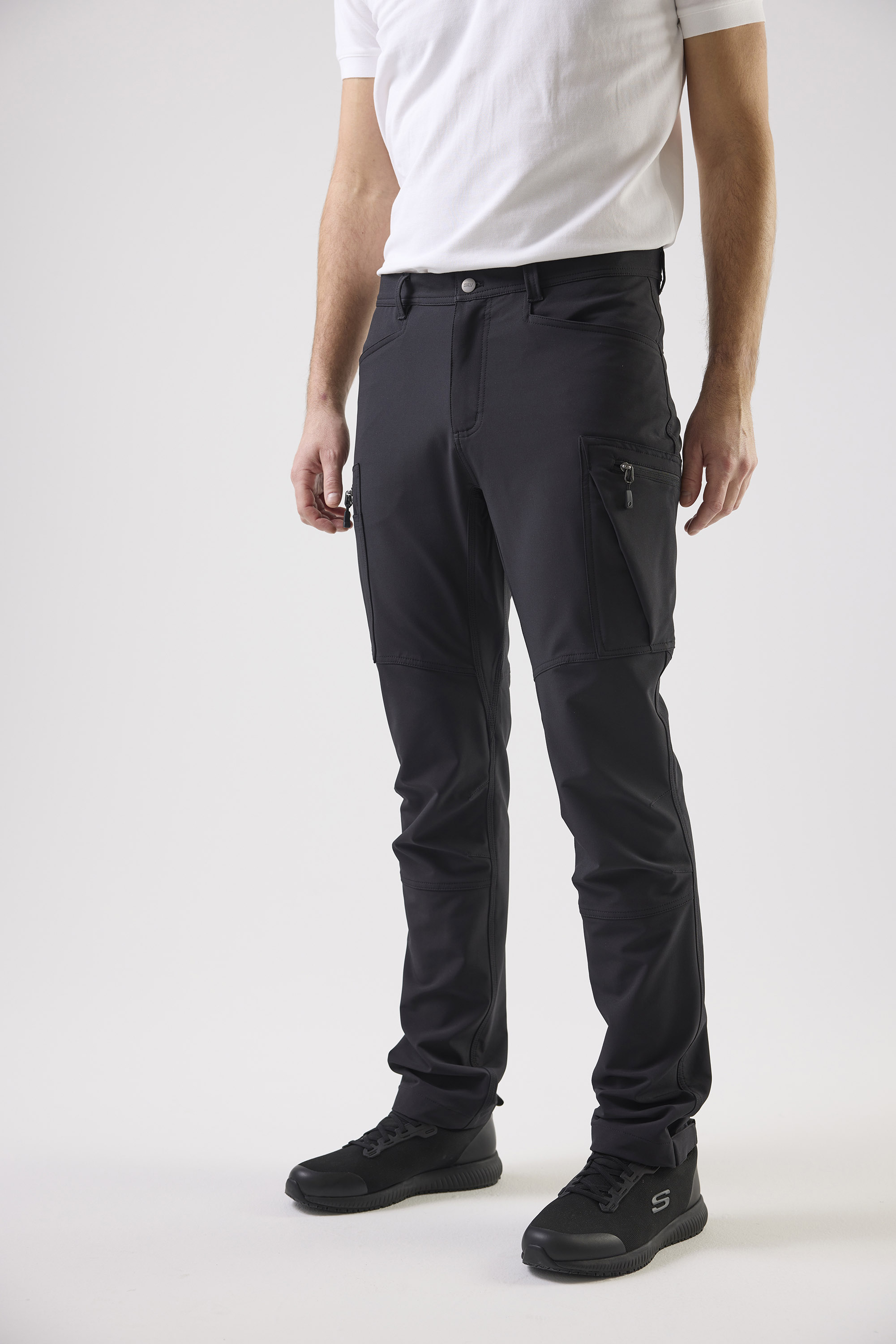 Nykyaikaiset työhousut kierrätetystä polyesteristä ja spandexista, joka takaa optimaalisen venyvyyden ja mukavuuden. Varustettu useilla käytännöllisillä taskuilla, mukaan lukien kynä- ja matkapuhelintasku. Reisitaskut ja takatasku vetoketjuilla ja heijastavilla yksityiskohdilla. Säären leveys säädettävissä tarranauhalla.