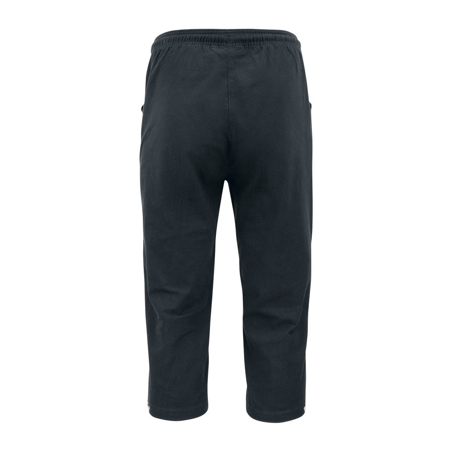 Unisex-caprihousut, joissa on joustava vyötärö ja kiristysnauha. Varustettu tilavilla etutaskuilla sekä säädettävällä lahkeen leveydellä että rengasnepparilla. Poimutettua puuvillaa.