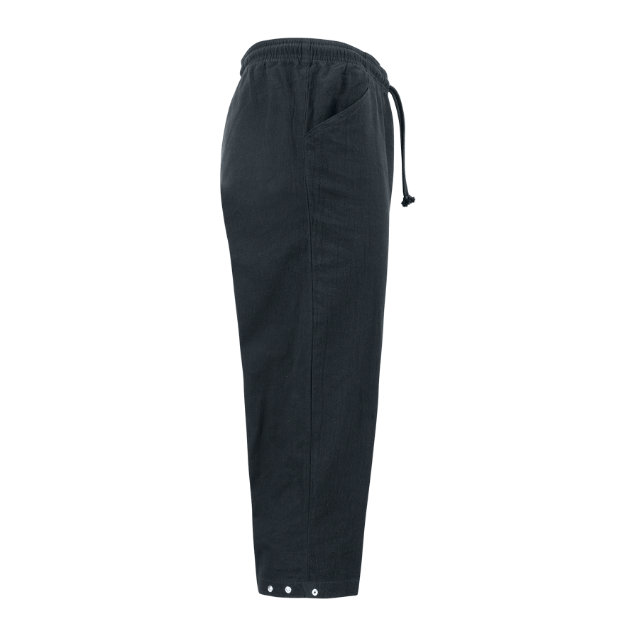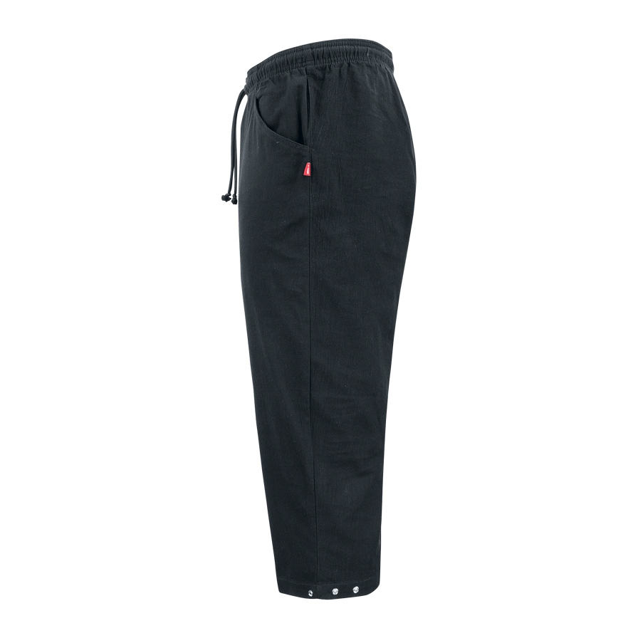 Unisex-caprihousut, joissa on joustava vyötärö ja kiristysnauha. Varustettu tilavilla etutaskuilla sekä säädettävällä lahkeen leveydellä että rengasnepparilla. Poimutettua puuvillaa.