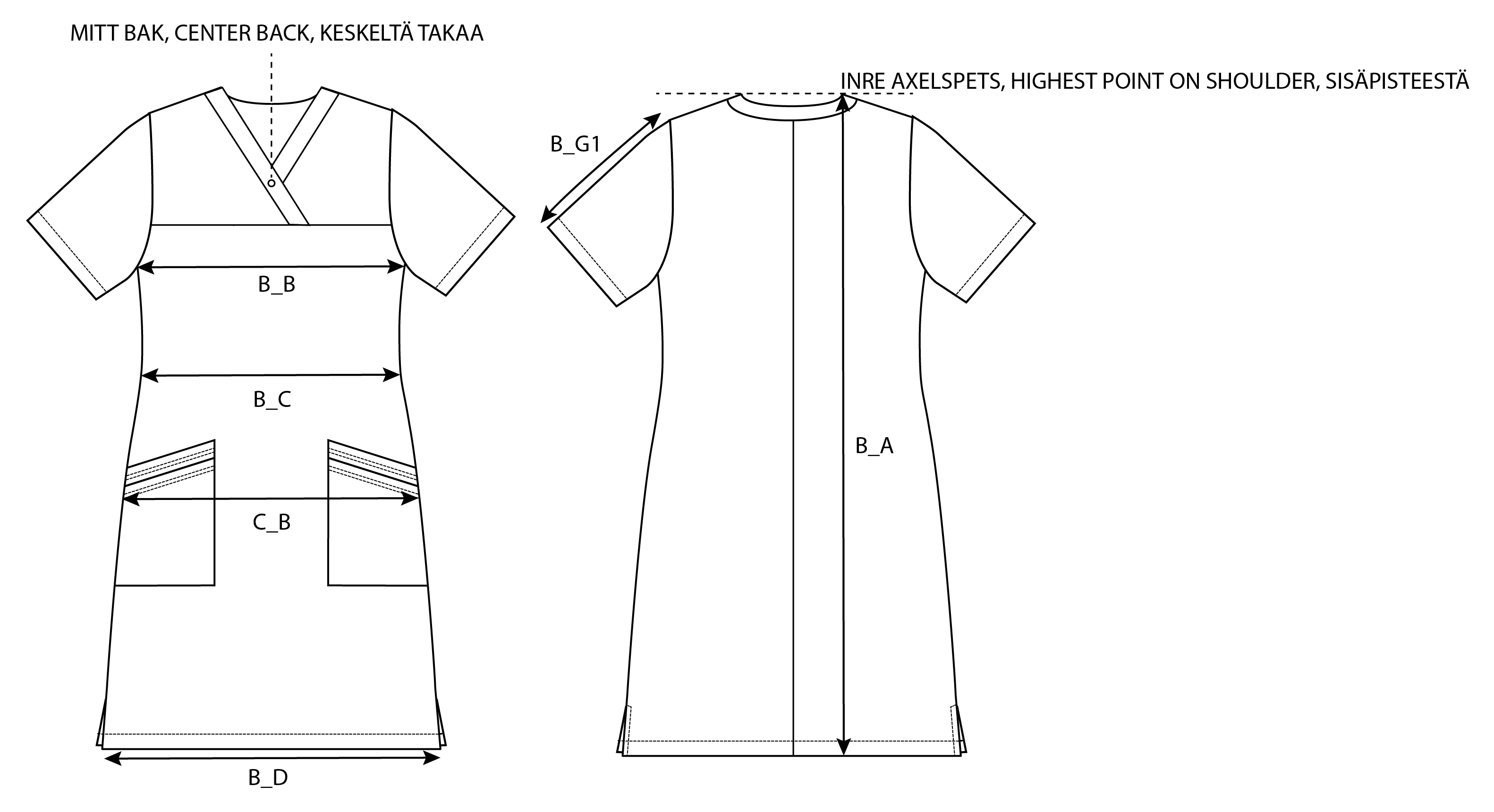 Kevyesti vartalonmyötäinen mekko, jossa V-pääntie. Edessä kaksi viistotaskua, joista toisessaavain-/korttipidike sekä rintatasku. V-pääntiessä rengas painonappi. Takapituus 100 cm koossa M.