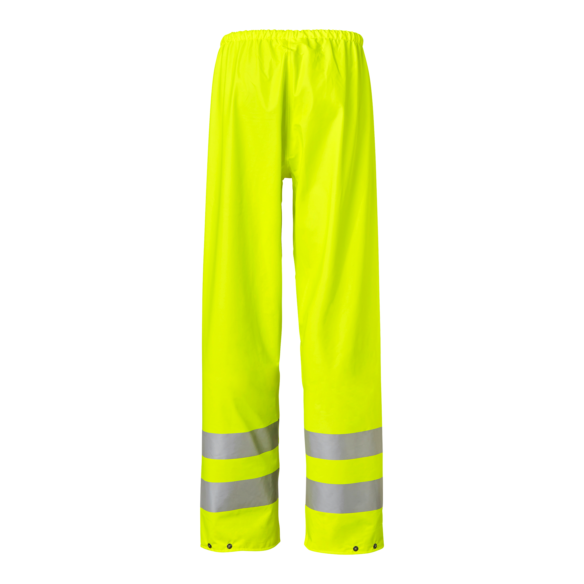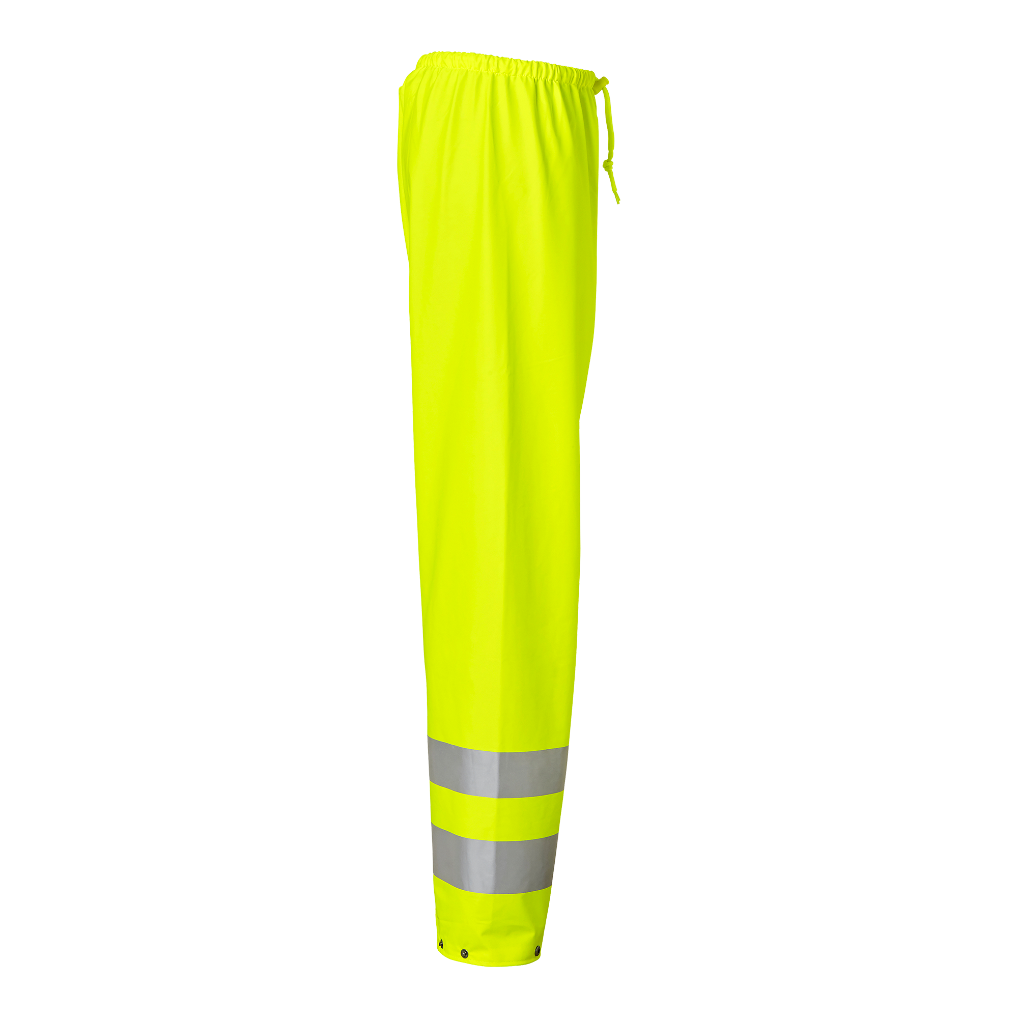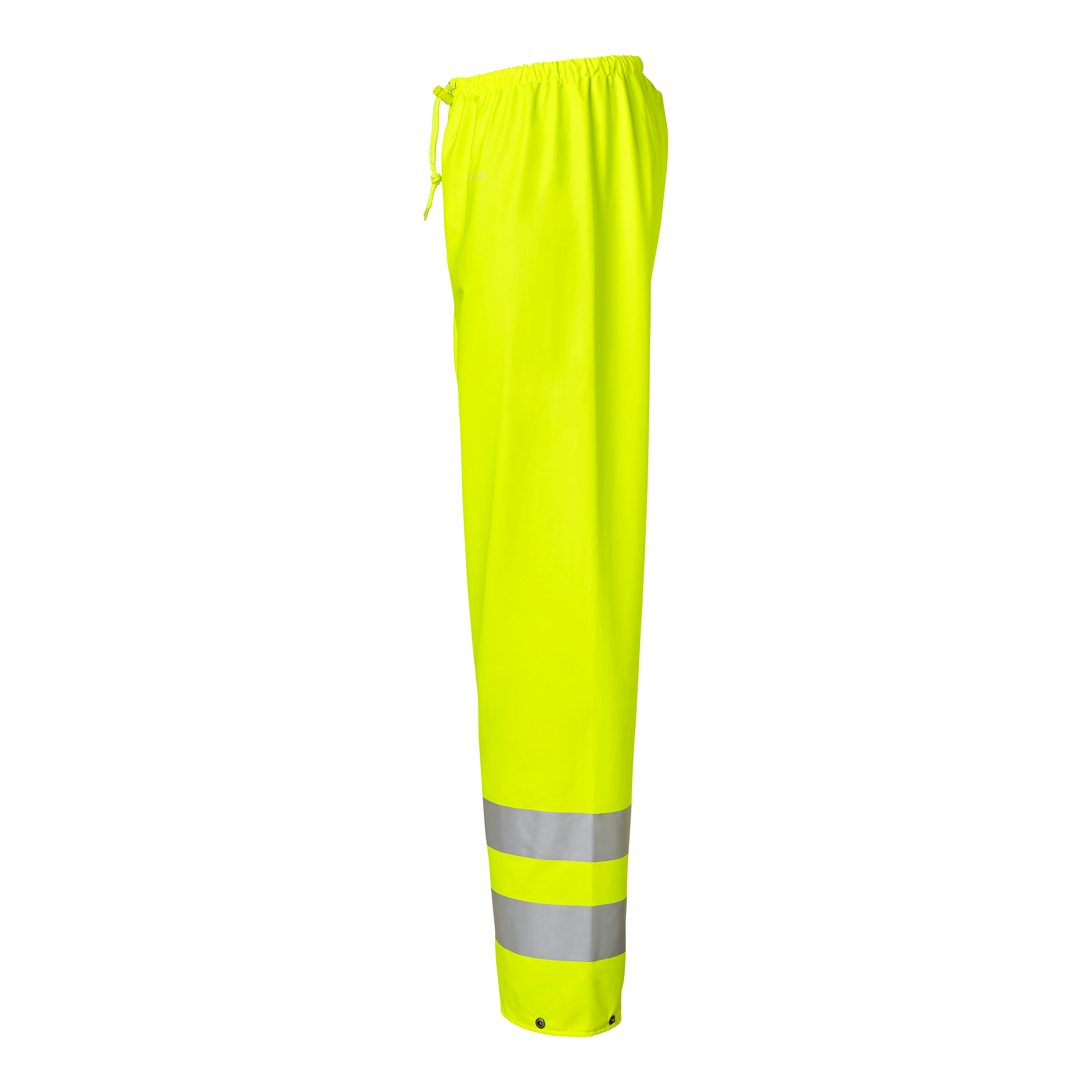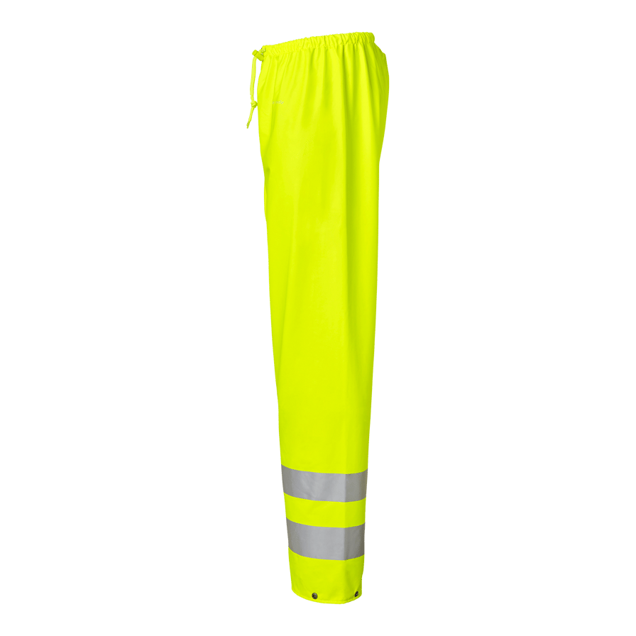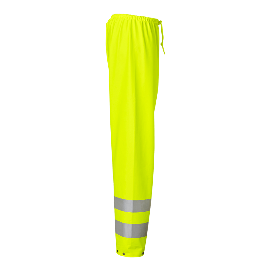 Huomiosadehousut, joissa on joustava ja säädettävä kiristysnauha vyötäröllä sekä säädettävät lahkeensuut. Hitsatut saumat takaavat optimaalisen vedenpitävyyden ja erinomaisen näkyvyyden. Ihanteelliset työskentelyyn sateisissa olosuhteissa.