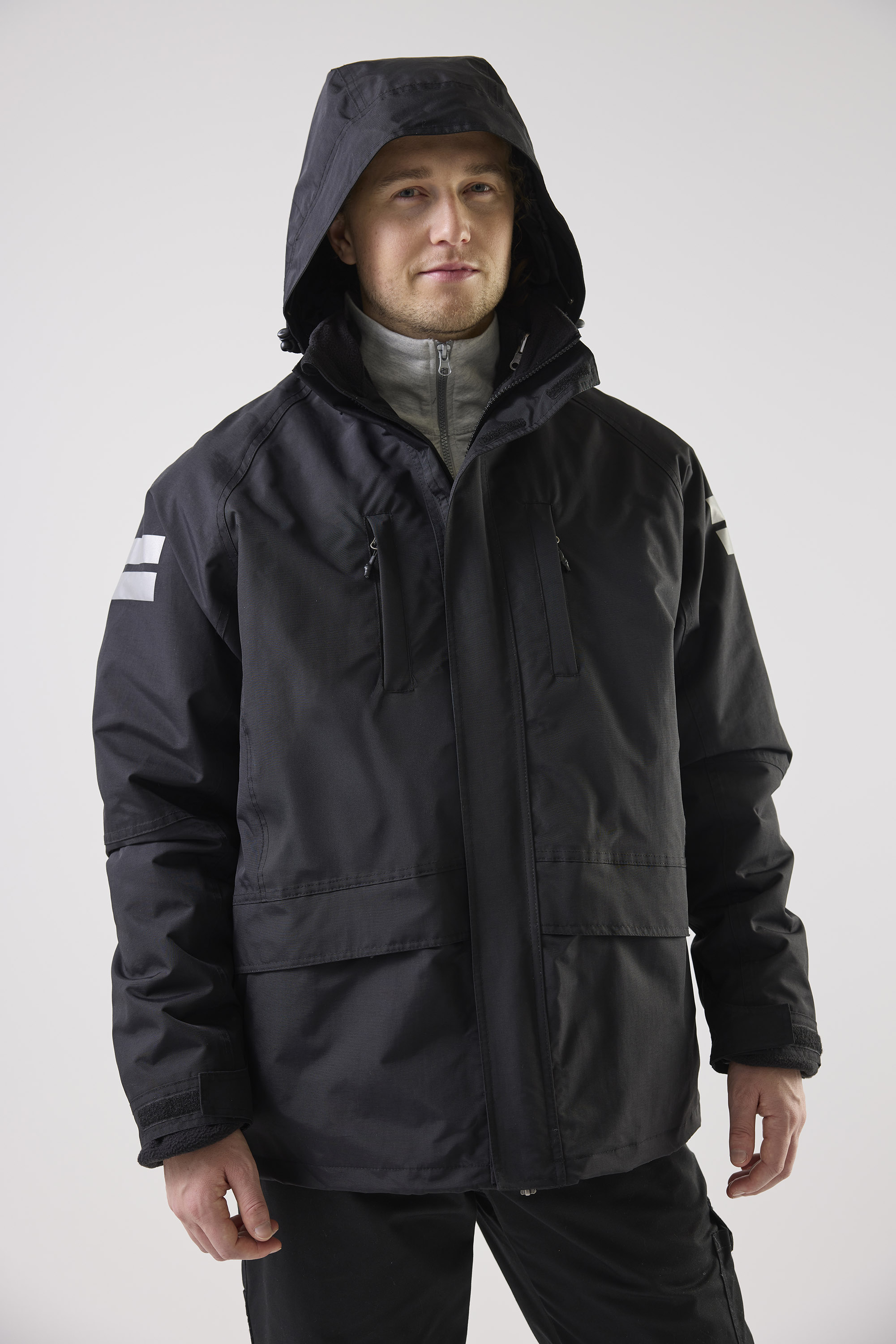 Top Swede 3-in-1 -takki. Tuulen- ja vedenpitävä, teipatuilla saumoilla varustettu, ja mukana irrotettava mikrofleece-sisätakki. Takissa on heijastavia yksityiskohtia, irrotettava huppu, useita taskuja ja säädettävät hihansuut.