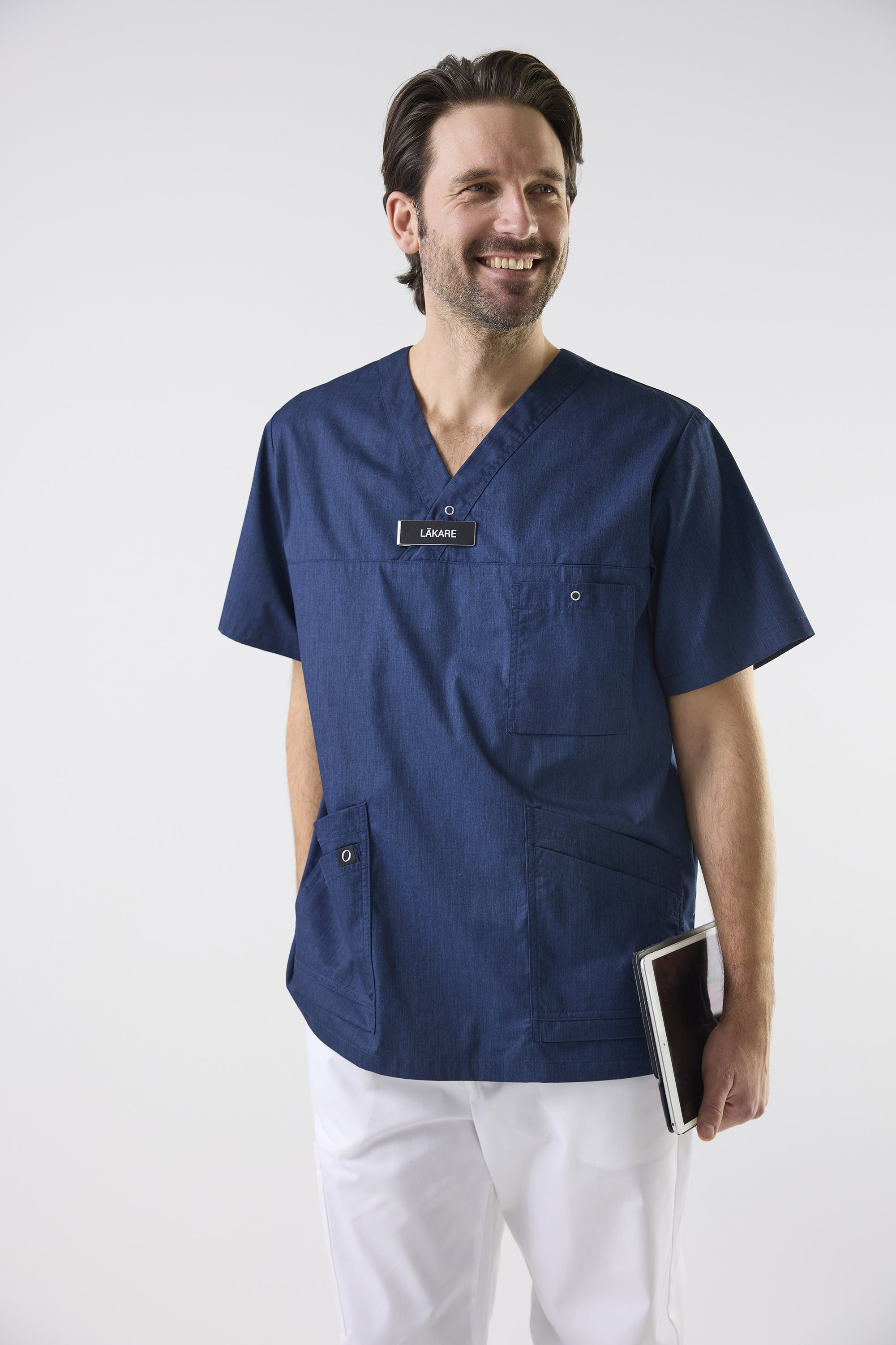 Unisex V-tunika mukavassa ja tilavassa mallissa. Kaksinkertaiset viistot etutaskut ja rintatasku, jossa avaimenpidike ja neppari. Halkot sivuilla.