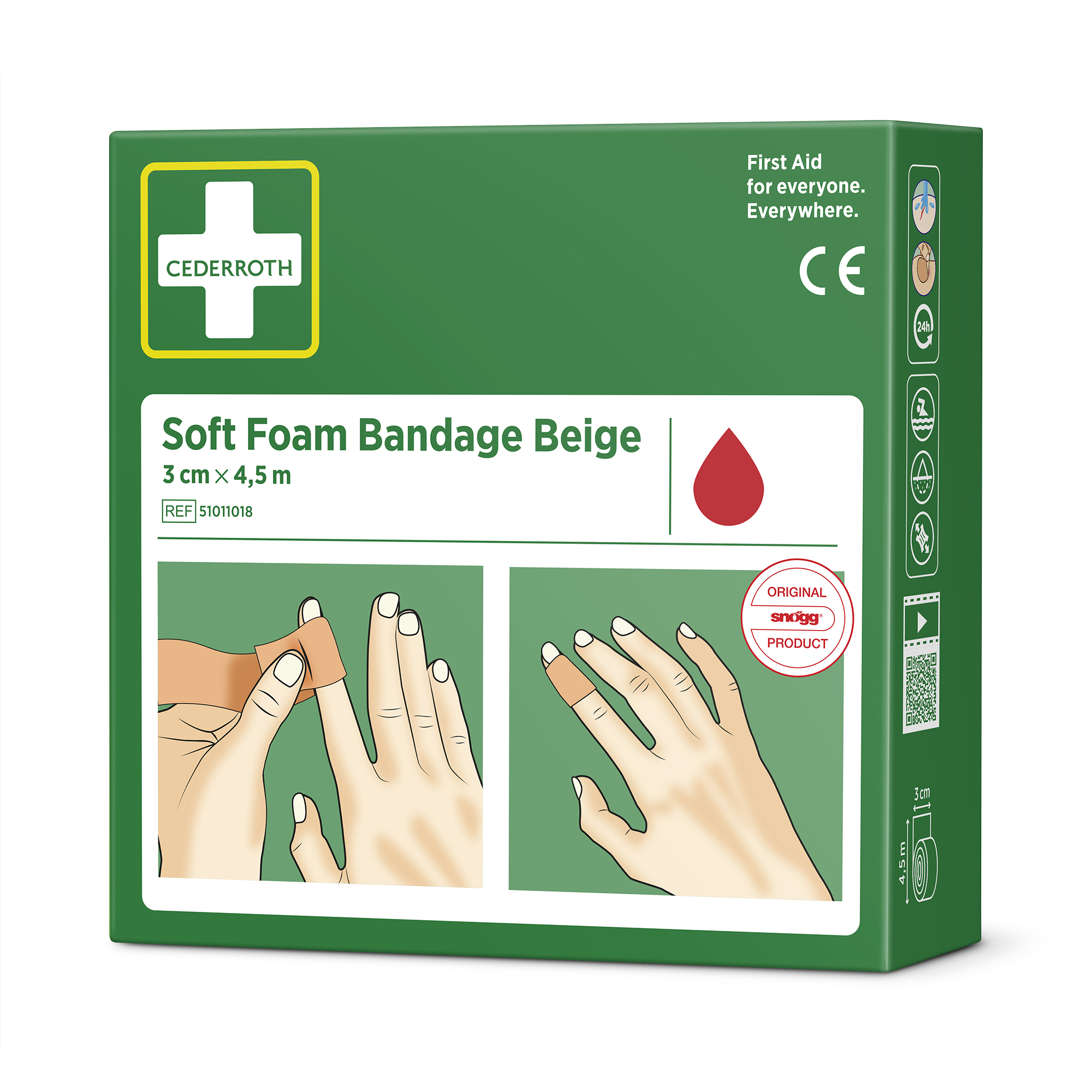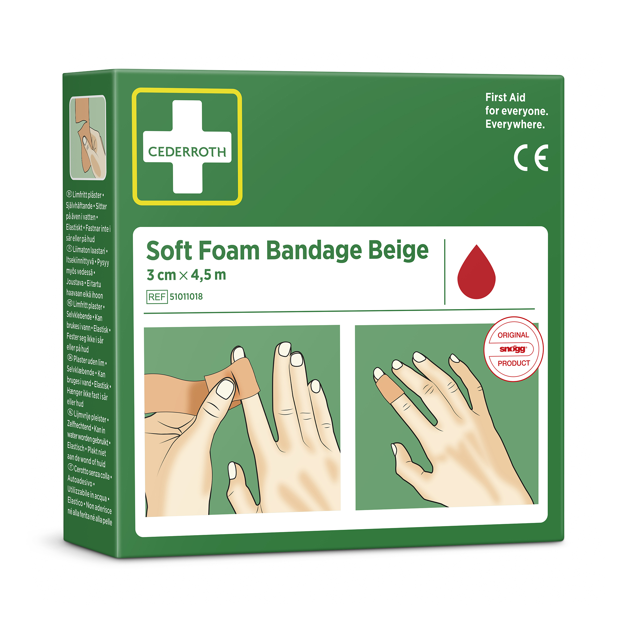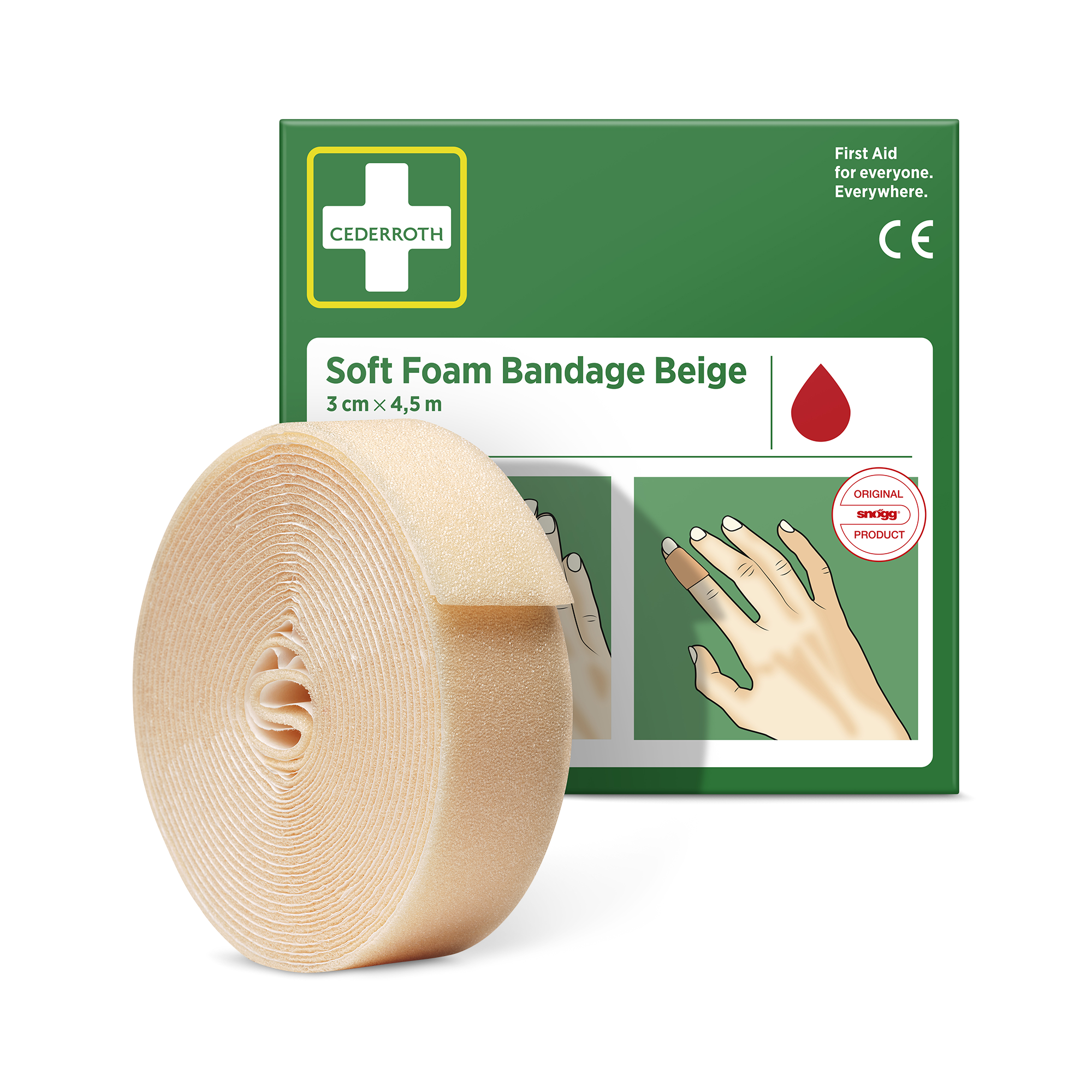 Cederroth Soft Foam Bandage Beige med 3 cm bredde passer perfekt for fingre eller tær. Passer som refill til Soft Foam Bandage 2-in-1 Dispenser (REF 510004108).