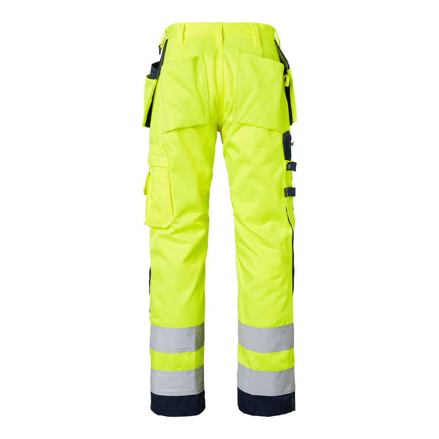 Top Swedes 2813 Trousers er den ultimate håndverkerbuksen for deg som trenger slitesterkt og funksjonelt arbeidstøy. Buksen er designet med forbøyde knær og Cordura®-forsterkede knelommer med to kneputer for optimal komfort og beskyttelse. Buksen har praktiske, skjulte spikerlommer, en skjult ID-kortlomme og to lommer foran og bak med klaff og borrelåsfeste. I tillegg er det en benlomme med klaff, en telefon- og pennlomme, en tommestokklomme med knivknapp og knivsløyfe, samt et hammerhåndtak og D-ring i frontklaffen. Perfekt for krevende arbeidsmiljøer der både synlighet og funksjonalitet er avgjørende.