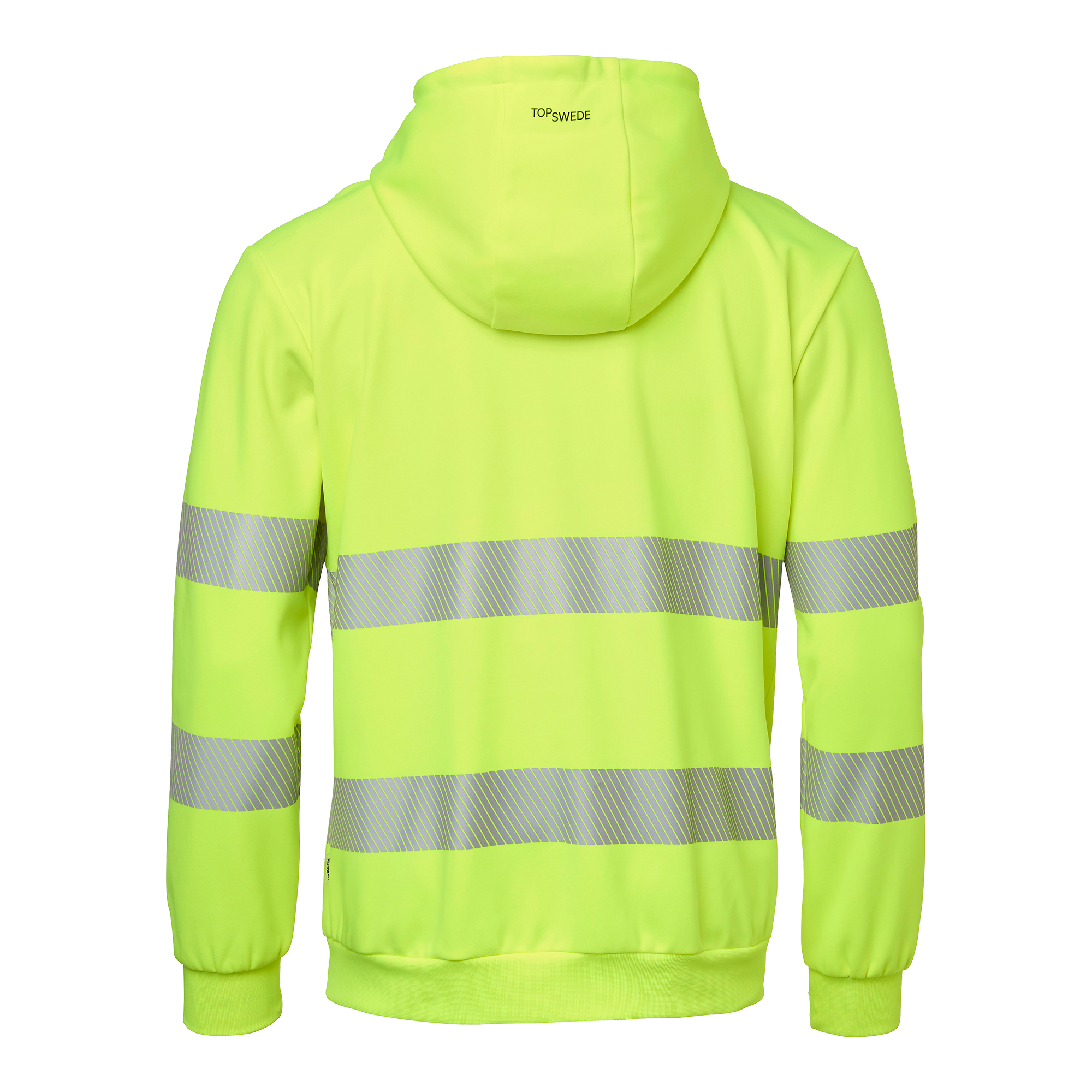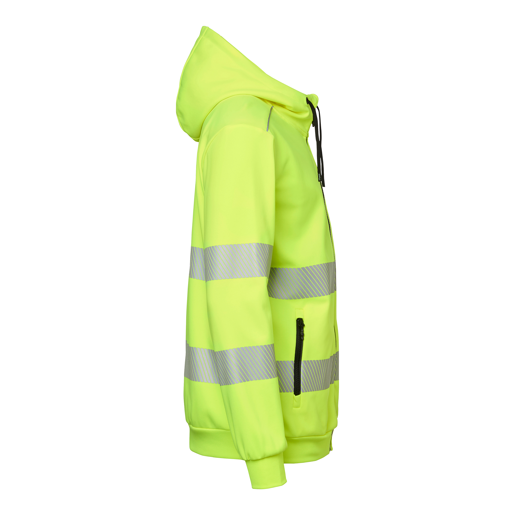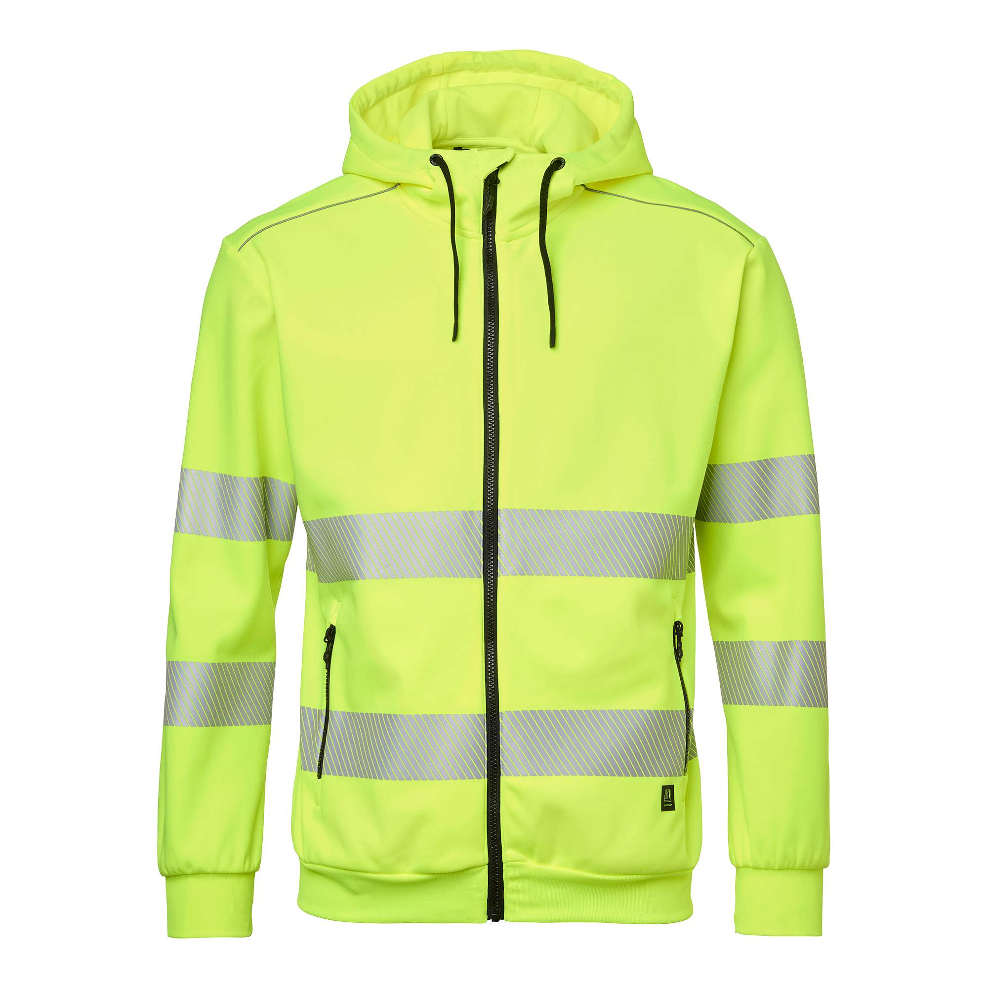 Varsel-hettegenser med hette, hel glidelås og segmentert refleks for økt synlighet. Utstyrt med to frontlommer med glidelås. Laget i resirkulert polyester for holdbarhet og komfort.