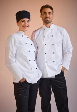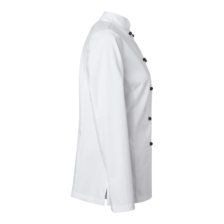 Elsa Chef’s Coat w er en klassisk kokkefrakk i damemodell med dobbeltknepping. Kokkefrakken har en romslig passform og lange ermer med enkle ermeavslutninger med splitt som er lett å brette opp. Frakken har pennelomme på venstre erme og en hempe i nakken. Knapper er ikke inkludert, men kan kjøpes separat i 10-pakning.