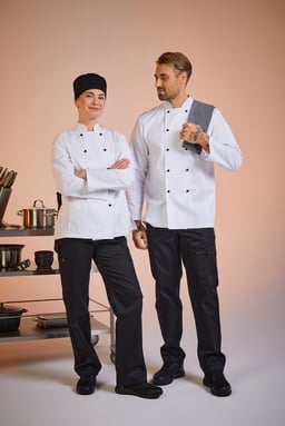 Oppdag Elsa Chef’s Coat w fra South West. En klassisk kokkefrakk i damemodell med dobbeltknepping. Kokkefrakken har en romslig passform og lange ermer med enkle ermeavslutninger med splitt som er lett å brette opp. Frakken har pennelomme på venstre erme og en hempe i nakken. Knapper er ikke inkludert, men kan kjøpes separat i 10-pakning. I størrelse 38 er lengden midt bak 70 cm.
