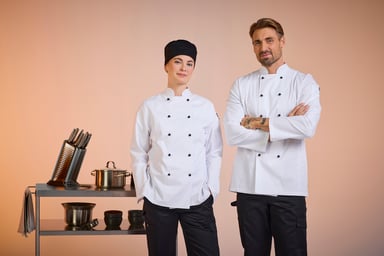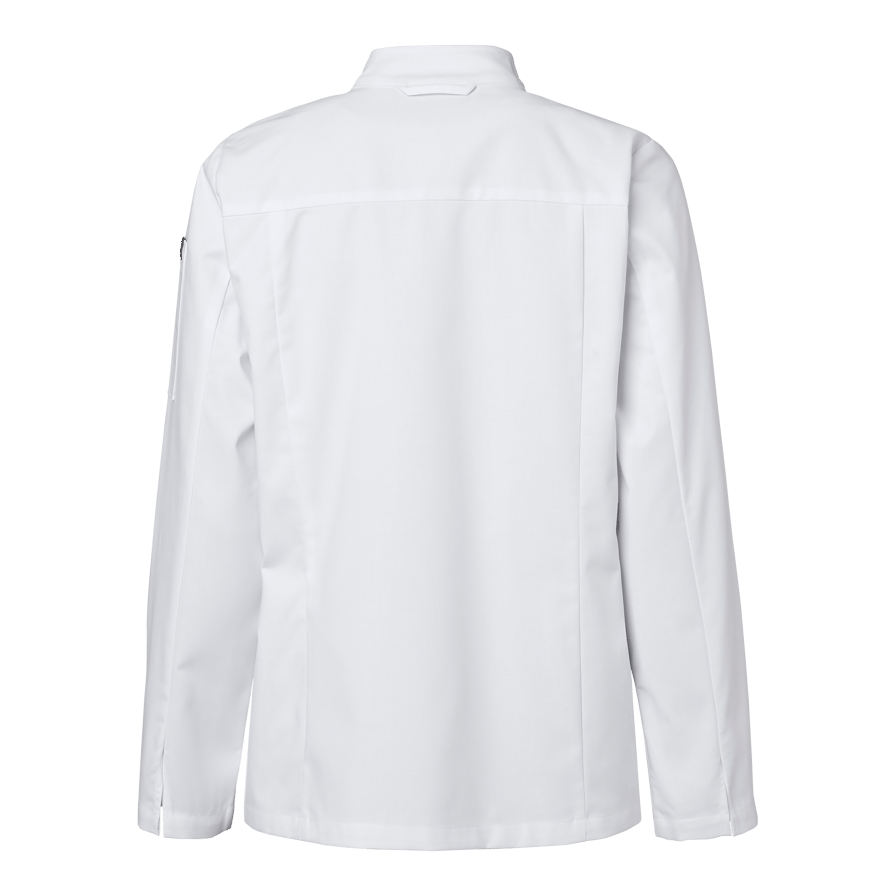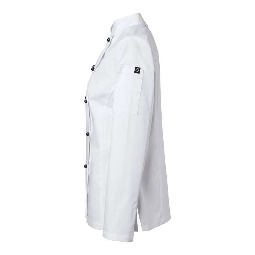 Elsa Chef’s Coat w er en klassisk kokkefrakk i damemodell med dobbeltknepping. Kokkefrakken har en romslig passform og lange ermer med enkle ermeavslutninger med splitt som er lett å brette opp. Frakken har pennelomme på venstre erme og en hempe i nakken. Knapper er ikke inkludert, men kan kjøpes separat i 10-pakning.