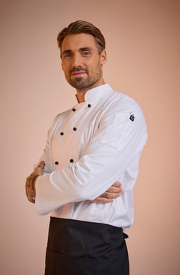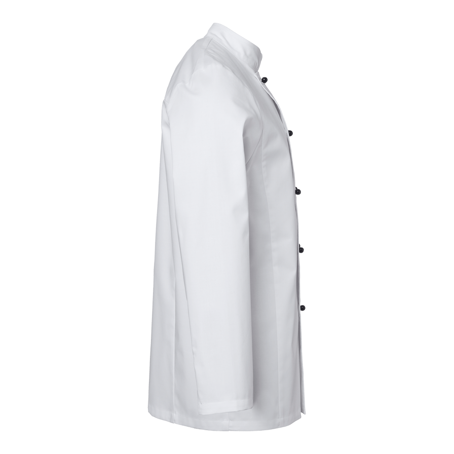 Elton Chef’s Coat er en klassisk kokkefrakk i herremodell med dobbeltknepping. Kokkefrakken har en romslig passform og lange ermer med enkle ermeavslutninger med splitt som er lett å brette opp. Frakken har pennelomme på venstre erme og en hempe i nakken. Knapper er ikke inkludert, men kan kjøpes separat i 10-pakning.