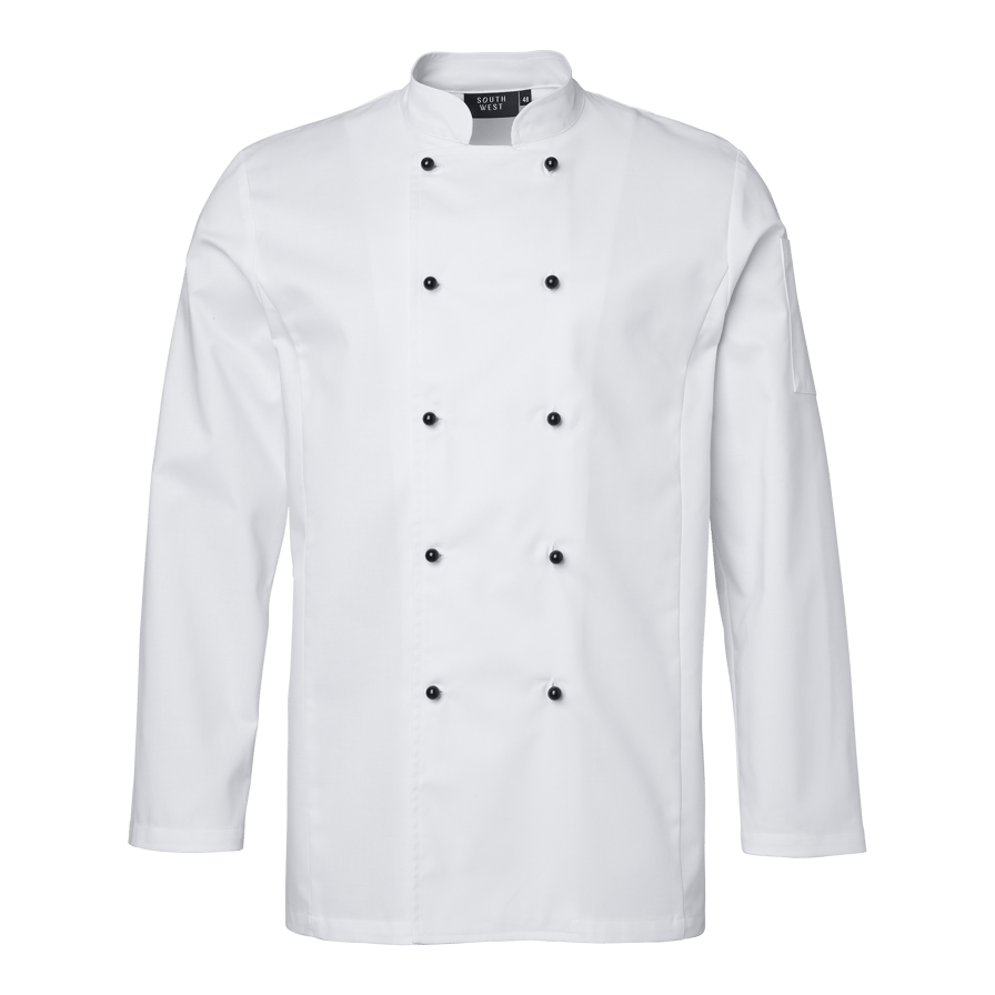Oppdag Elton Chef’s Coat fra South West. En klassisk kokkefrakk i herremodell med dobbeltknepping. Kokkefrakken har en romslig passform og lange ermer med enkle ermeavslutninger med splitt som er lett å brette opp. Frakken har pennelomme på venstre erme og en hempe i nakken. Knapper er ikke inkludert, men kan kjøpes separat i 10-pakning. I størrelse C50 er lengden midt bak 78 cm.