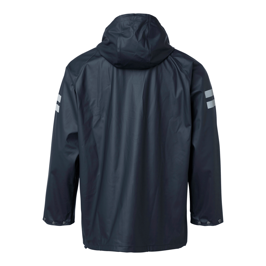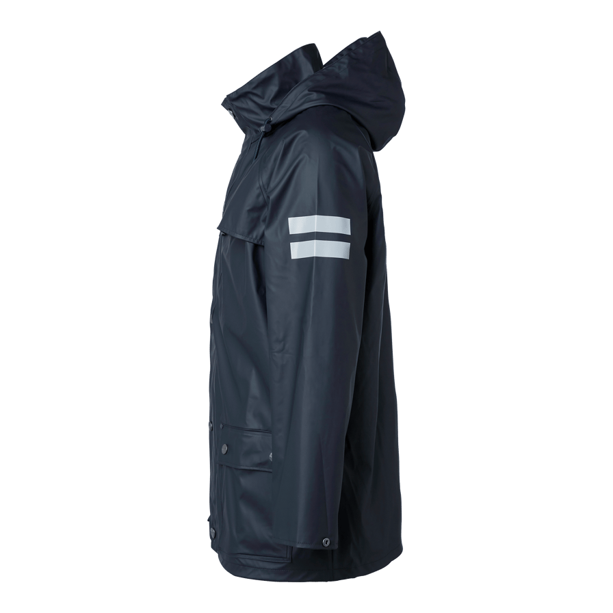 Regnjakke 80 cm i glatt stretchmateriale med sveisede sømmer. To frontlommer med klaff, glidelås med klaff og trykknapper, og hette med snøring. Justerbare mansjetter for optimal passform.