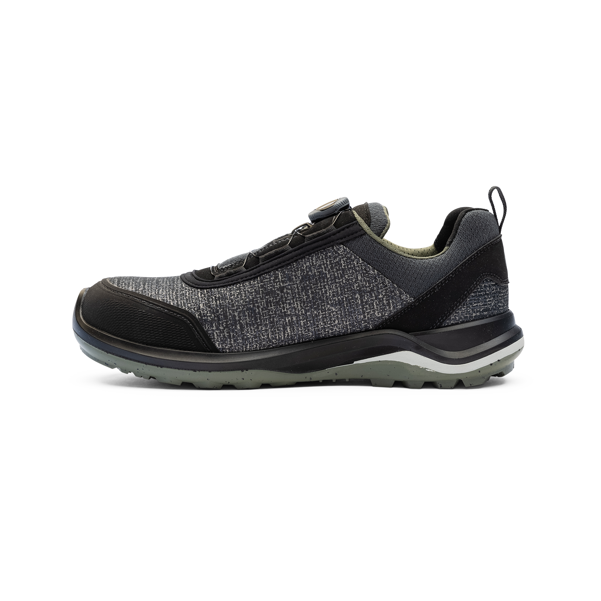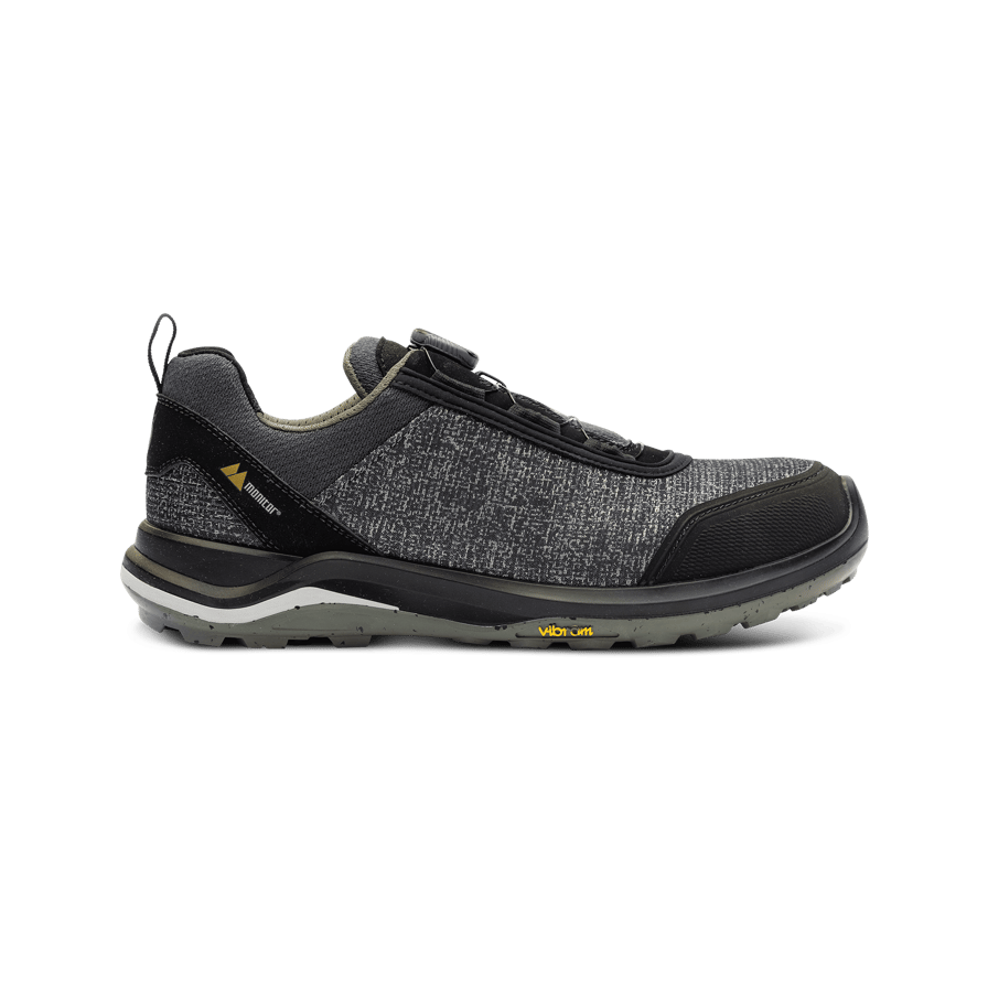 Monitor Eco Green Safety Shoe er en bærekraftig vernesko med overdel i resirkulert PET-plast og Vibram-yttersåle i resirkulert gummi. Skoen har tåkappe i aluminium, mellomsåle i PU og BOA® Fit System for en presis passform.