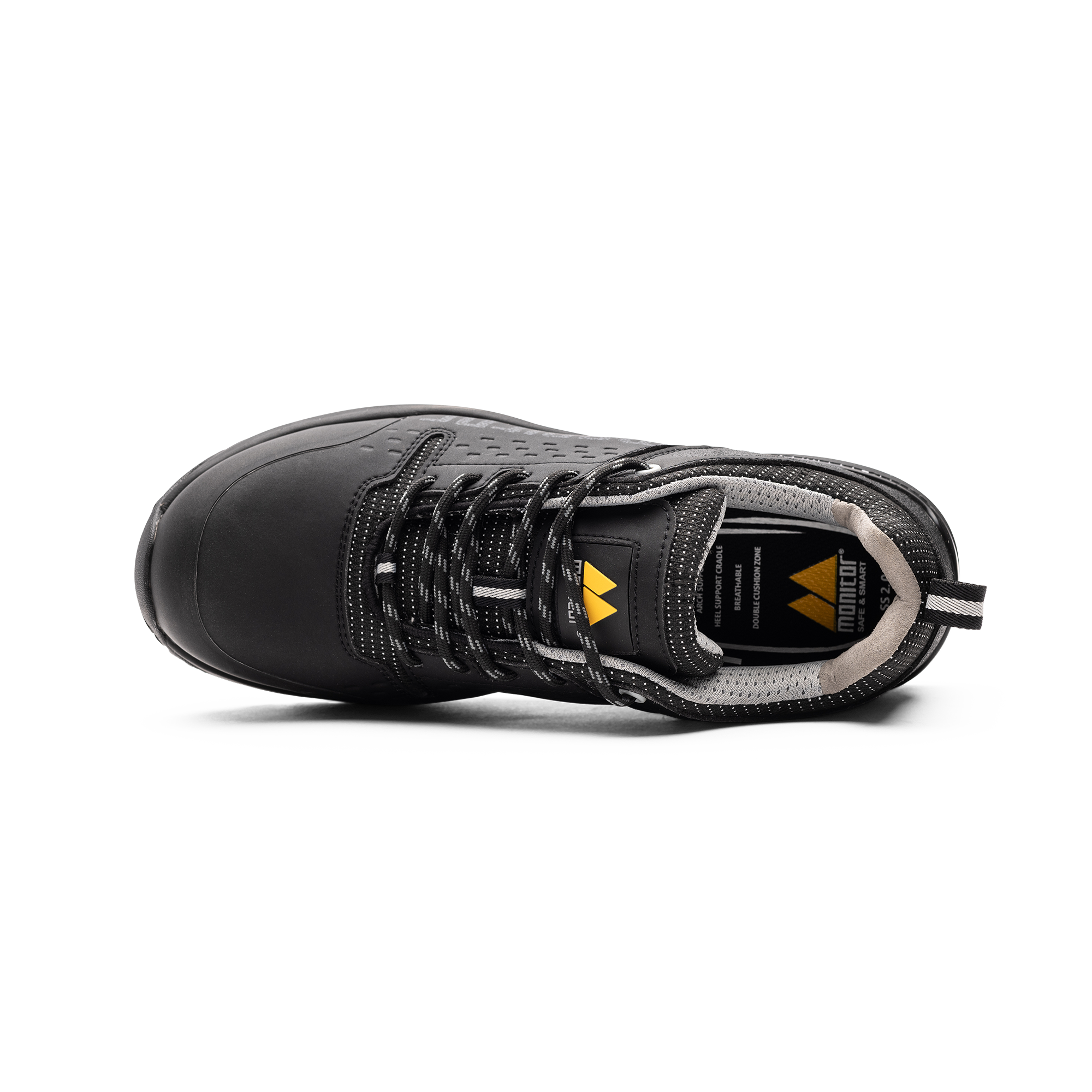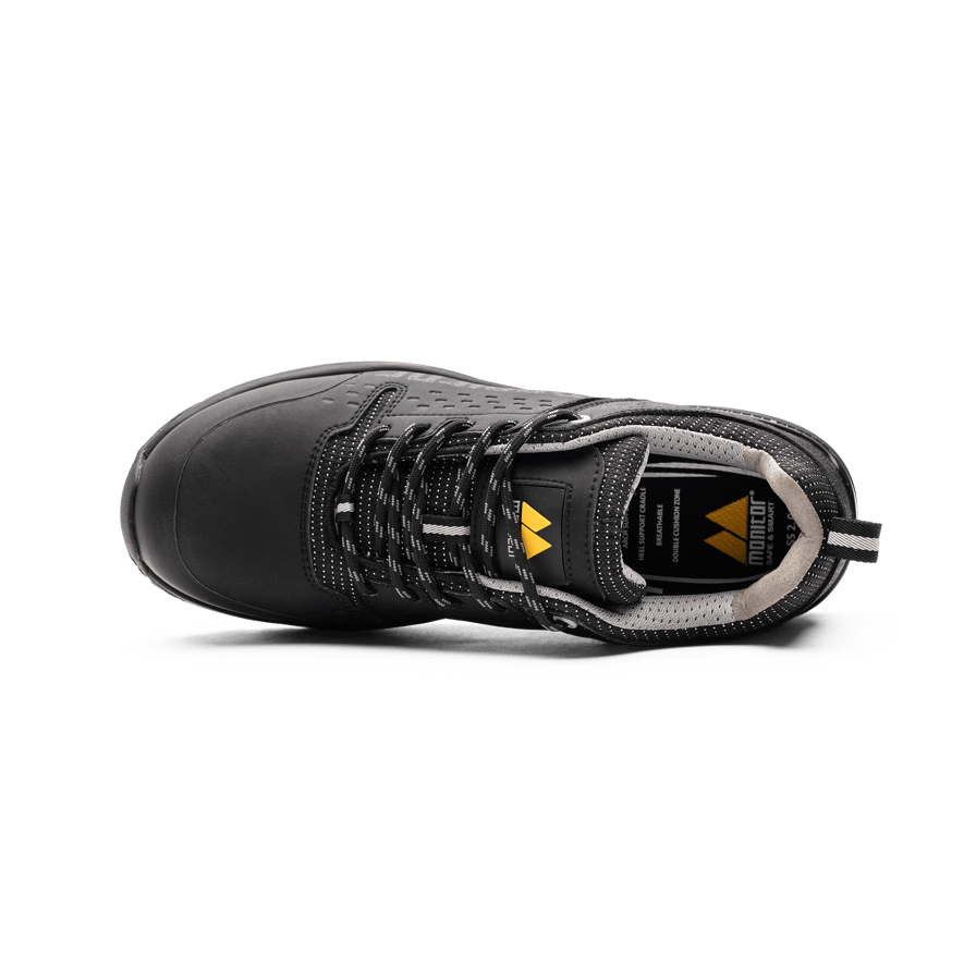 Monitor Force Safety Shoe er en S3-vernesko med overdel i mikrofiber og tekstil og en tynn TPU-neseforsterkning. Skoen har tåkappe i kompositt, myk APT-spikebeskyttelse og en yttersåle i EVA og gummi.