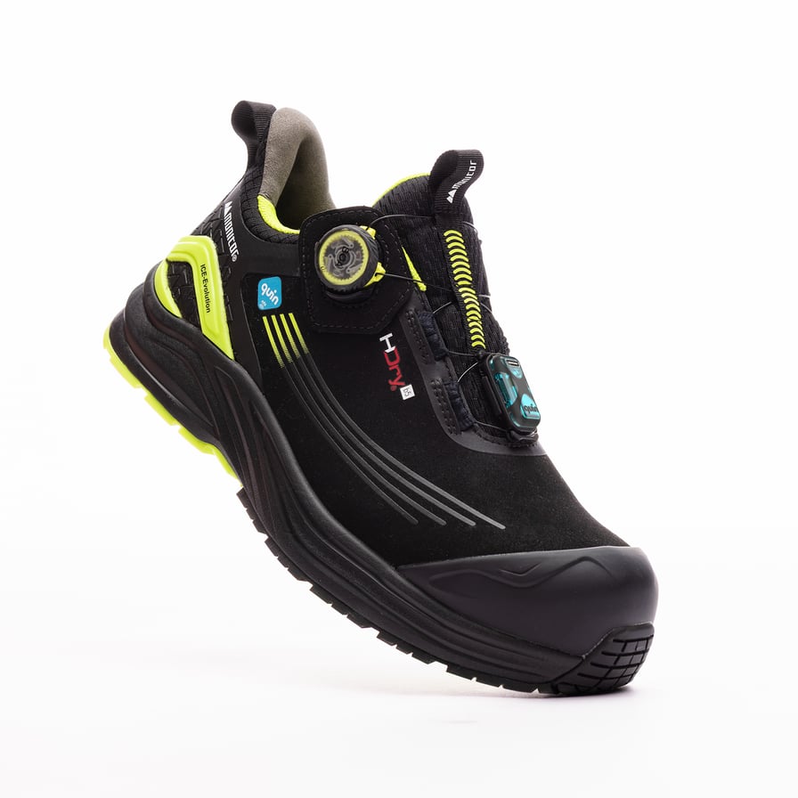 ICE Evolution Flow Connected er verdens første smarte vernesko – utstyrt med Quin Within, en fullt integrert sikkerhetssensor som automatisk varsler ved ulykker. Teknologien kan skille mellom alvorlige fall og mindre støt, og sender din status og posisjon i sanntid til tre utvalgte nødkontakter. Med Quin Plus aktiveres også ResQ*-funksjonen, som kobler deg til profesjonelle redningstjenester og deler viktig informasjon for rask hjelp. Verneskoen har Monitors unike Return-sålesystem, med TPU-stabilisator, ny Fit Tech-innersåle i Super Critical Foam, mellomsåle i samme materiale for utmerket demping og energiretur, APT-spikerbeskyttelse i tekstil og en slitesterk TPU-yttersåle. Den mikrofiberbaserte overdelen og Equip Fit Wide-lesten gir god passform og minimerer risikoen for gnagsår ved å tilpasses MNTR1-tåhetten. Li2 BOA® Fit System gjør det enkelt å justere passformen raskt og presist. Skoen har også et HDry Bio-membran laget av 53 % maisstivelse, laminert direkte mot overdelen for full vanntetthet. HDry «b5»-membranet inneholder 53 % biobasert materiale (maisstivelse), sertifisert av et ISO/IEC-akkreditert laboratorium, og opprettholder det høyeste nivået av teknisk ytelse.