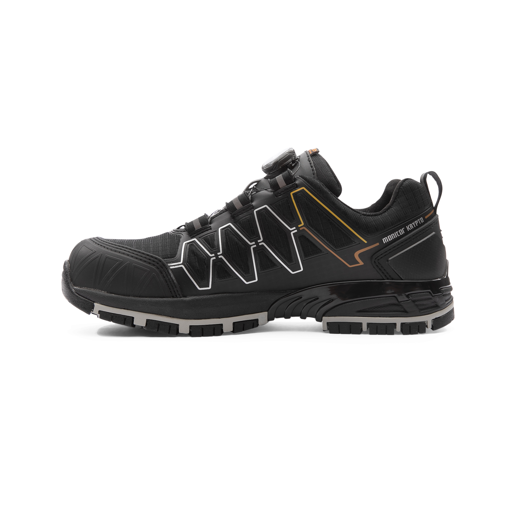 Monitor Krypto Safety Shoe er en sporty vernesko med overdel i mesh, ripstop og TPU og vanntett Monitex-membran. Skoen har tåkappe i aluminium, dempende EVA-mellomsåle og yttersåle i gummi. Utstyrt med BOA® Fit System for rask og enkel snøring.