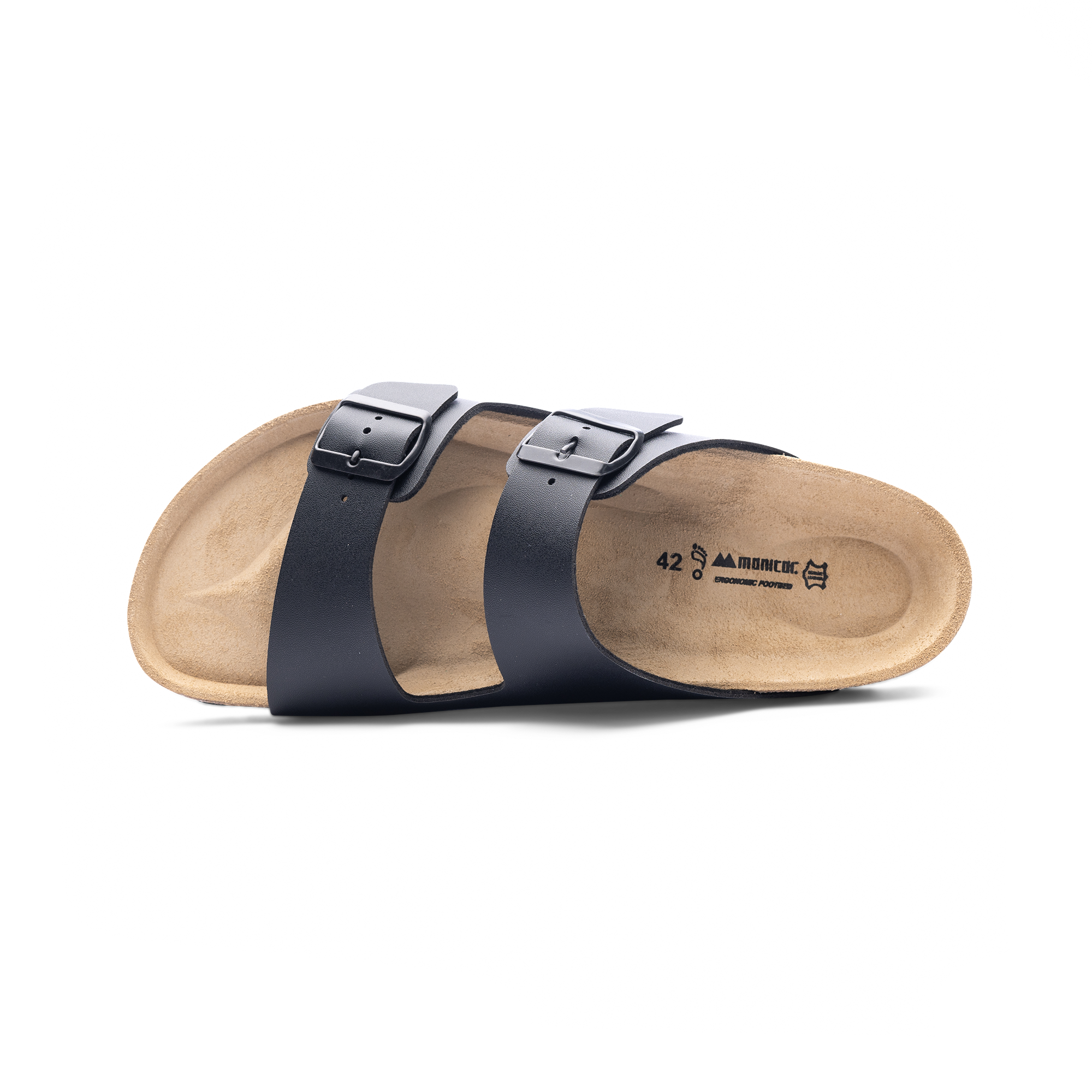 Monitors Cartago comfort-sandal er en klassisk korksandal der fotsengen tilpasser seg foten din og gir den beste støtten. Under nøtteskalltrekket ligger en 2 mm tykk lateksfilm som bidrar til den myke komforten. Overdelen er laget av mikrofiber, og yttersålen er klassisk EVA. Bred lest.