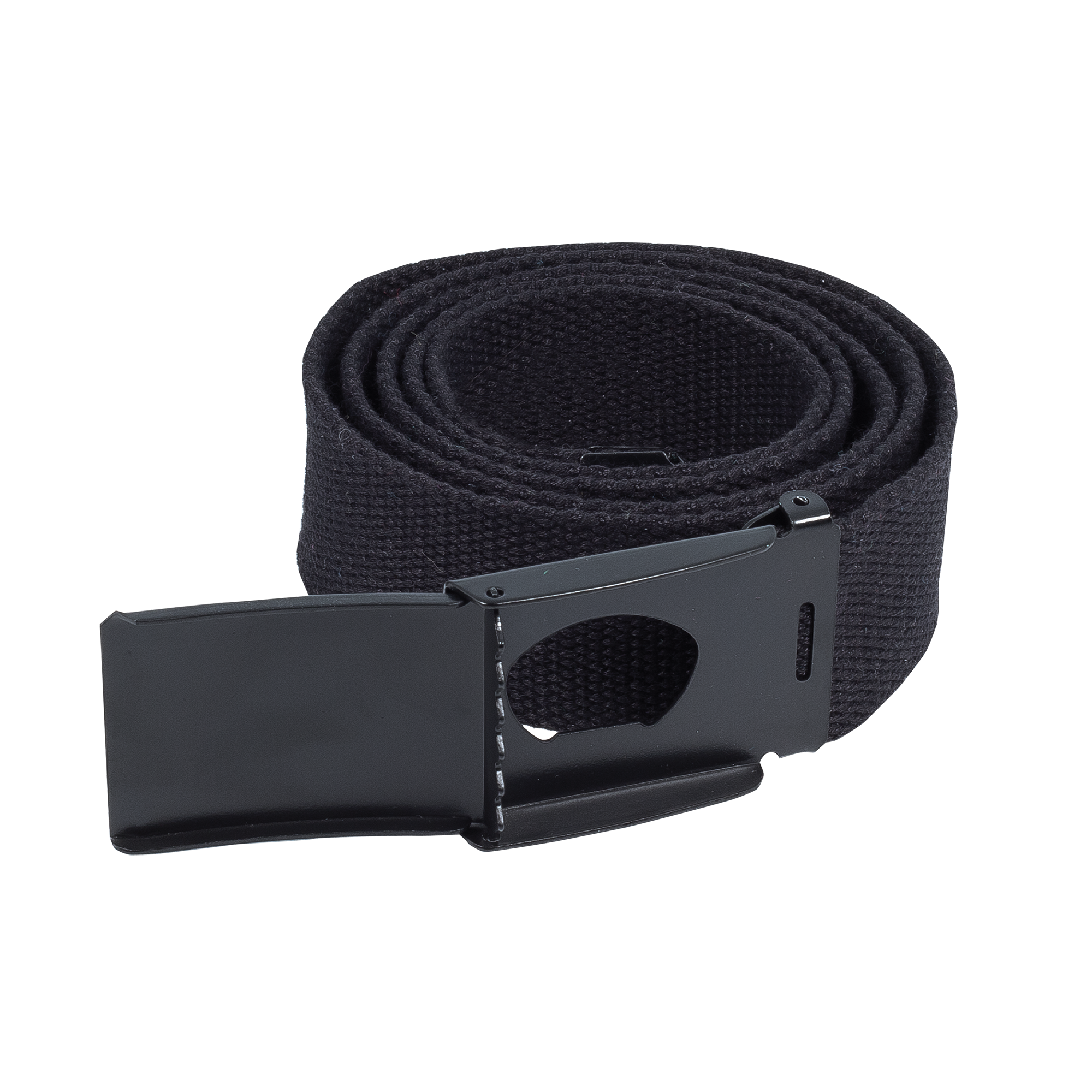 Stilrent bälte i polyester med metallspänne ton-i-ton och logo på metallavslutet. Spännets insida fungerar som kapsylöppnare. Längd 120 cm, bredd 4 cm.