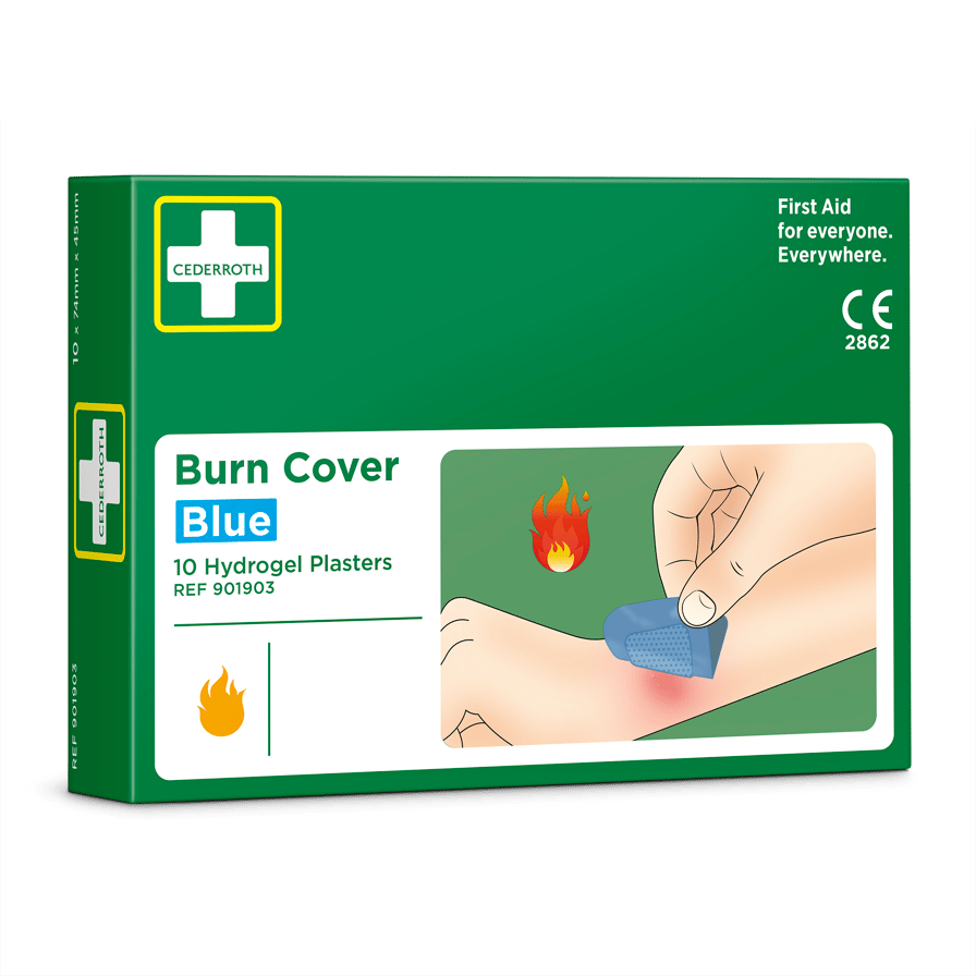 Cederroth Burn Cover skyddar och lindrar vid mindre brännsår och ska användas efter avkylning av brännskadan. Sårdynan består av en sval hydrogel som täcker hudens nervtrådar och hjälper till att lindra. Samtidigt skapas en fuktig miljö vilket motverkar bildning av sårskorpor och ger snabbare sårläkning. Sårdynan fastnar inte i sår. Cederroth Burn Cover är blå till färgen för att synas bättre, vilket gör de lämpliga att använda vid hantering av livsmedel. Produktfördelar: ger snabbare sårläkning. Fastnar inte i sår. Varje ask innehåller 10 sterila plåster (74 x 45 mm). Sårdynan består av en vattenbaserad hydrogel. Hållbarhetstid 3 år. Asken passar i Cederroths Första Hjälpen-stationer.