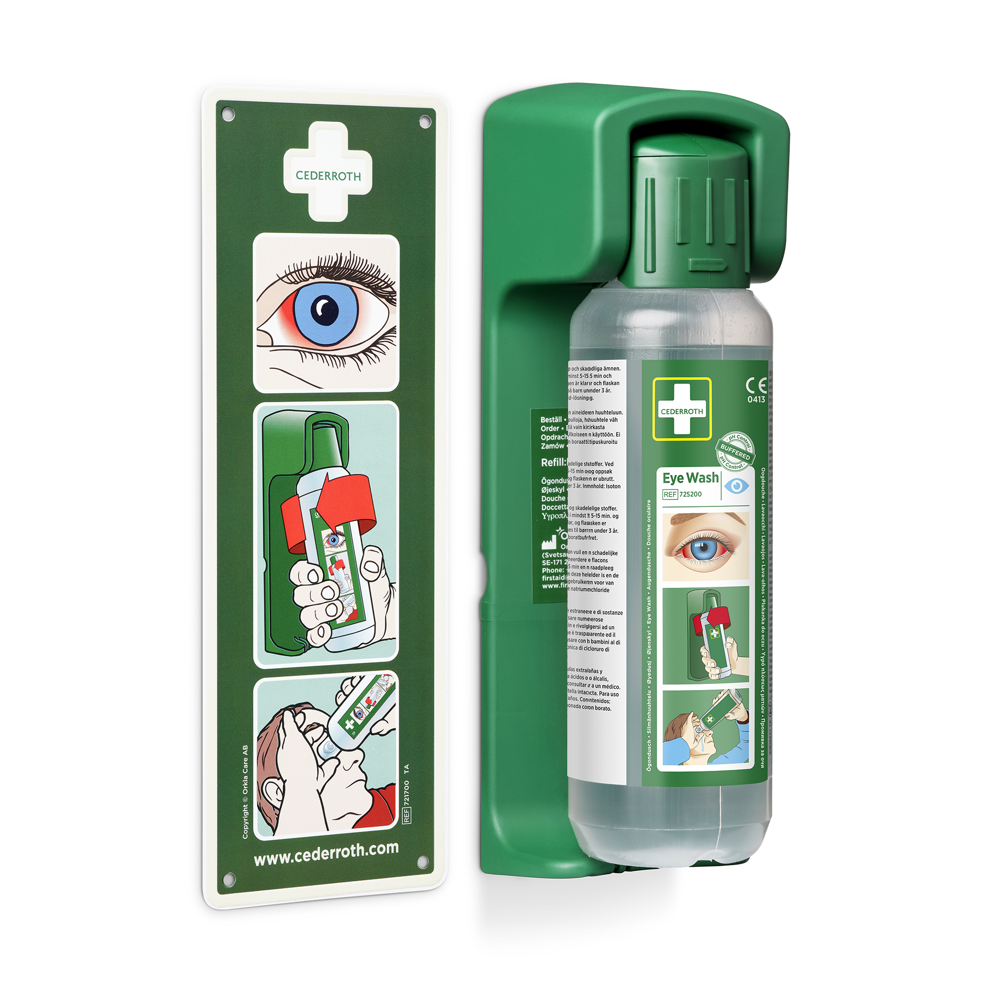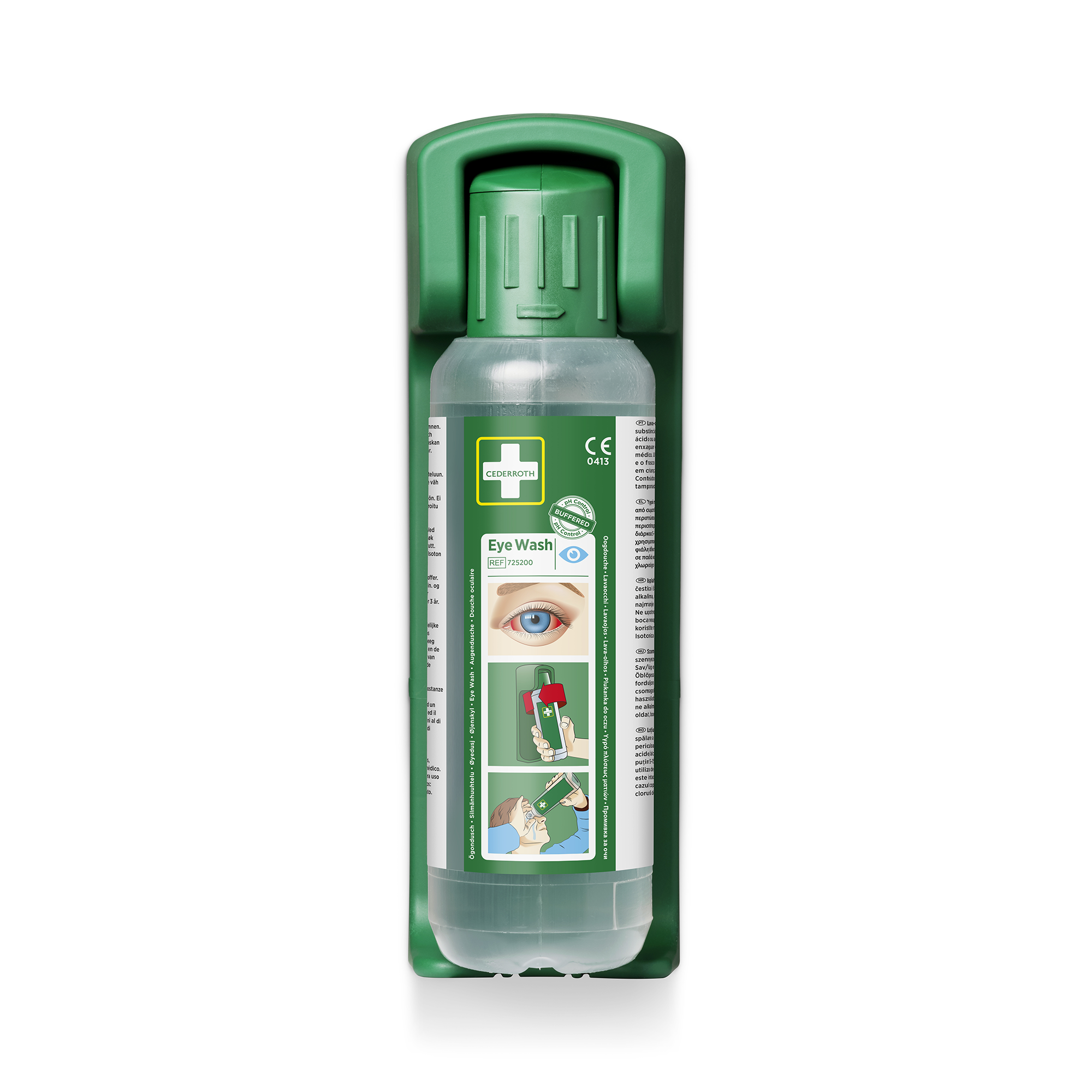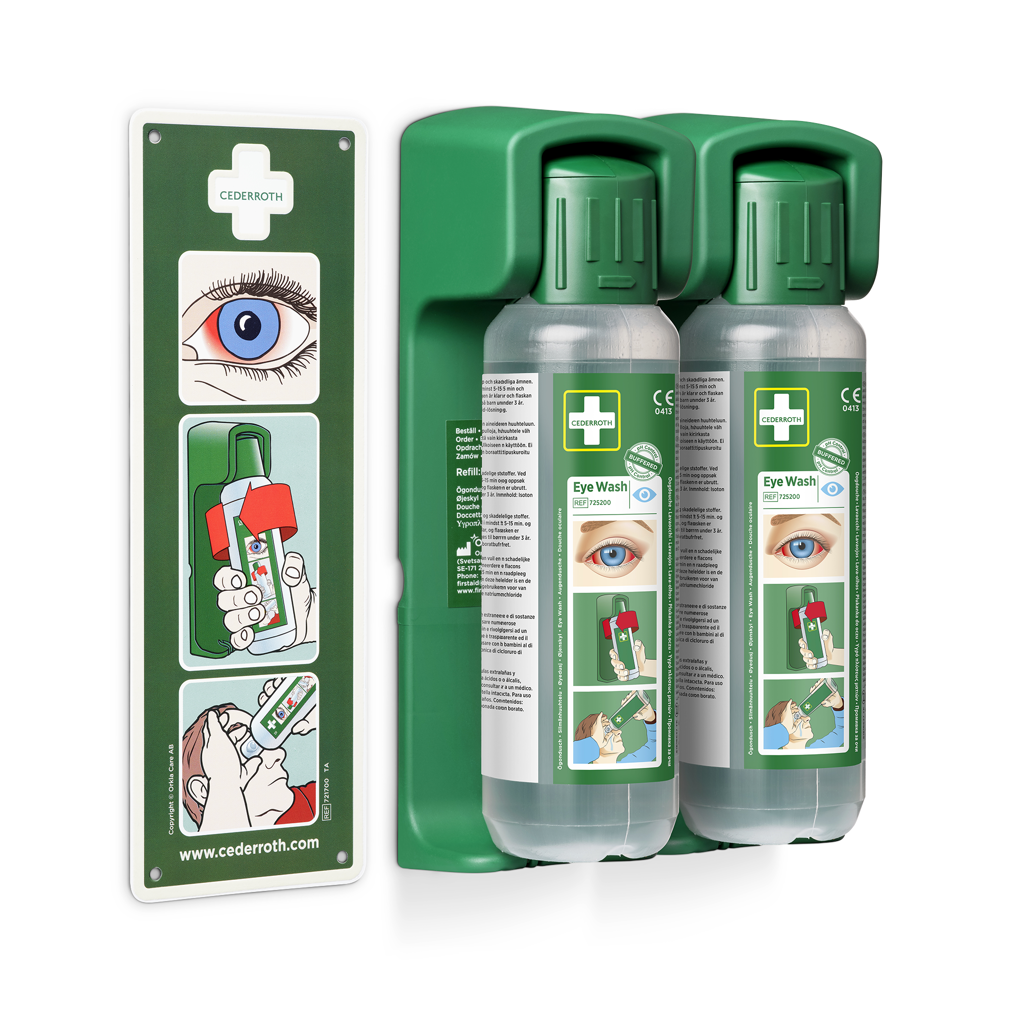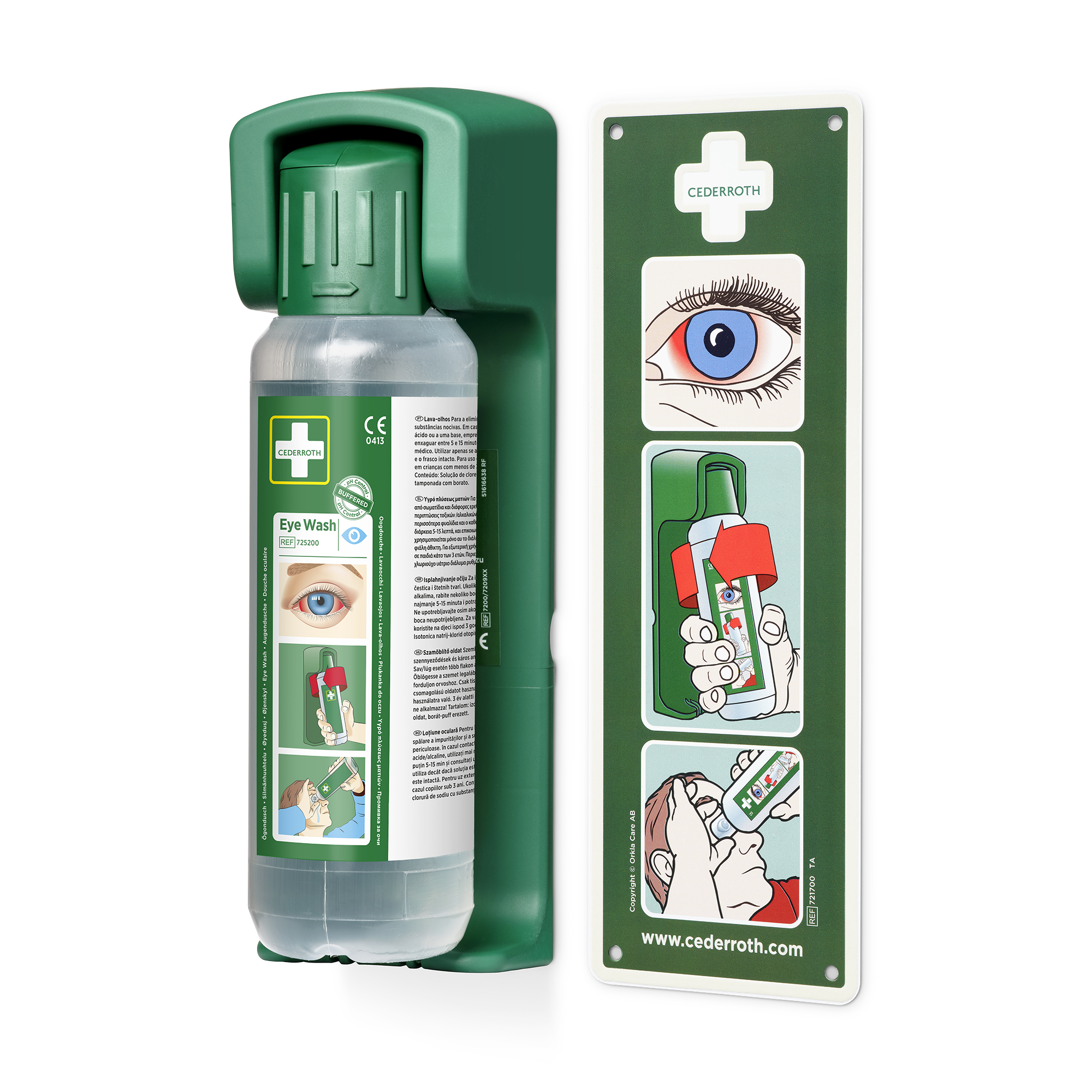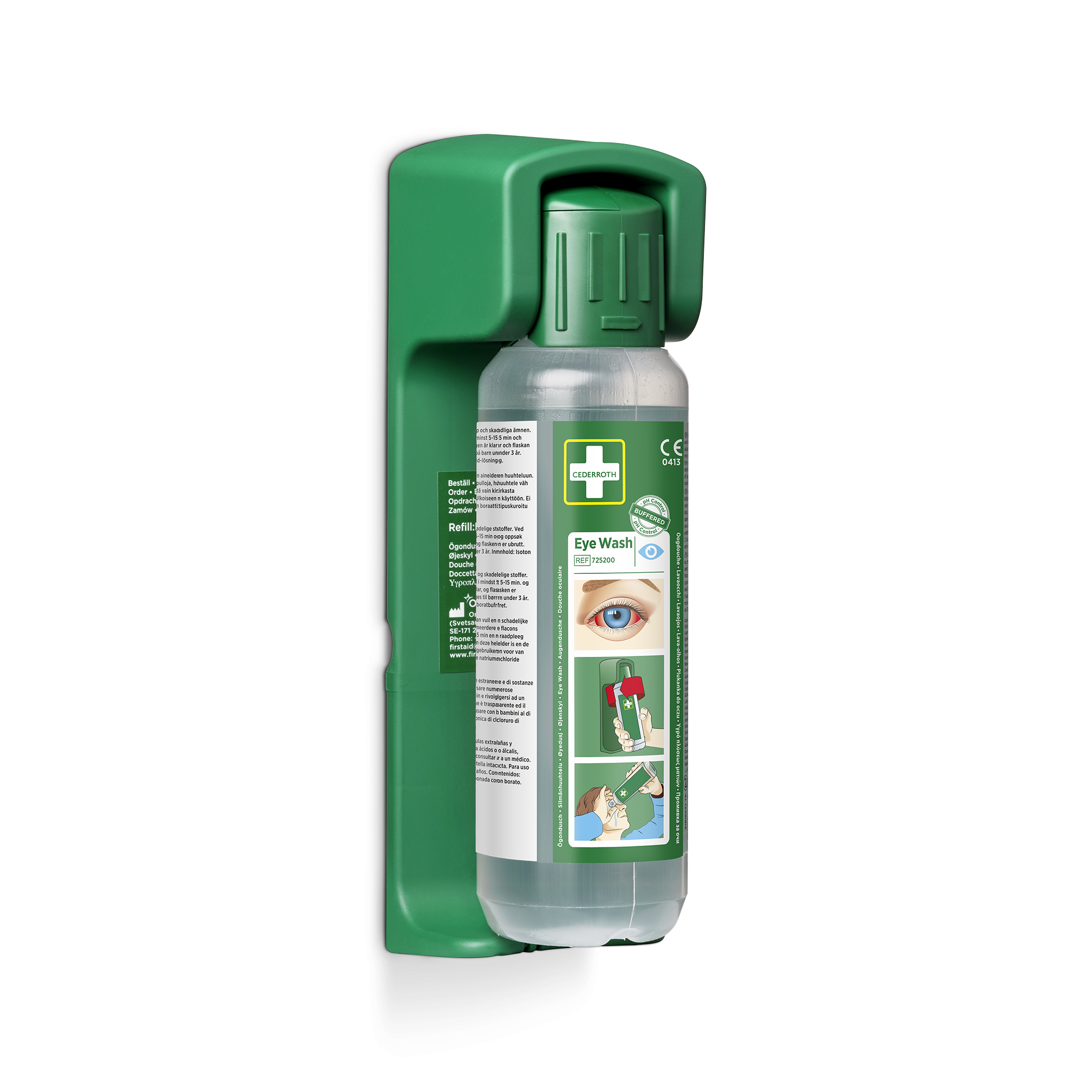 Robust och praktisk vägghållare för Cederroth Ögondusch 500 ml (REF 725200). Med vägghållaren får flaskan en bestämd plats så att alla vet var den finns. Flaskan sitter fastlåst i vägghållaren och öppnas automatiskt när den vrids ur hållaren – ögonsköljning kan påbörjas omedelbart. Kan placeras på flera olika sätt och passar därför alla arbetsplatser och lokaler. Efterlysande instruktionsskylt medföljer.