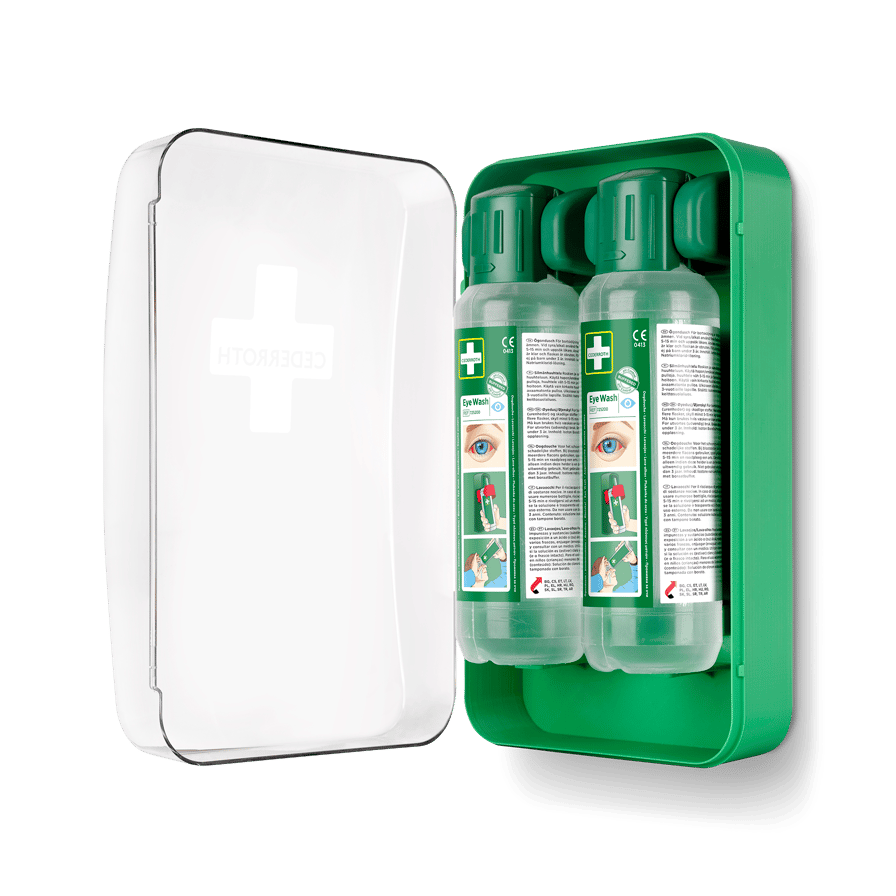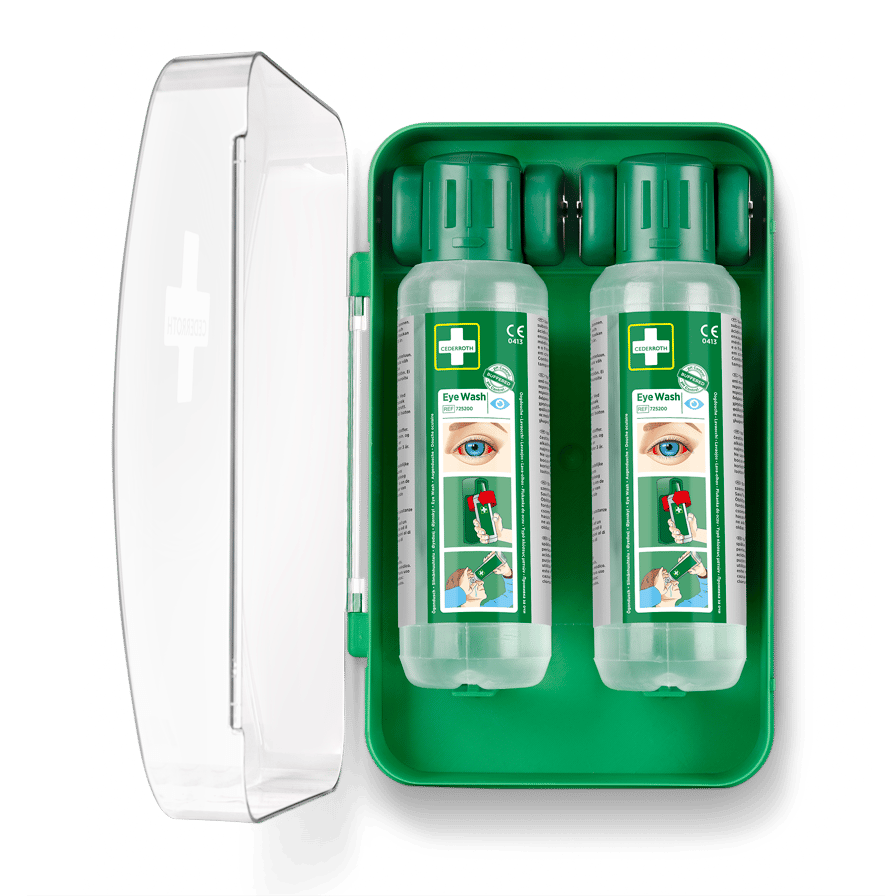 Ett kompakt ögonduschskåp som skyddar mot damm och vatten. Inkluderar 2 flaskor Cederroth Ögondusch. Lätt att få plats med även i mindre utrymmen. Transparent lucka för hög synlighet. Flaskorna öppnas automatiskt när de vrids ur hållarna och sköljning kan påbörjas omedelbart. Innehåller: 2 Cederroth Ögonduschflaskor à 500 ml (REF 725200). 1 Instruktionsskylt. Plasten i Cederroth Eye Wash Cabinet är från sommaren 2025 tillverkad av >78% återvunnen plast.