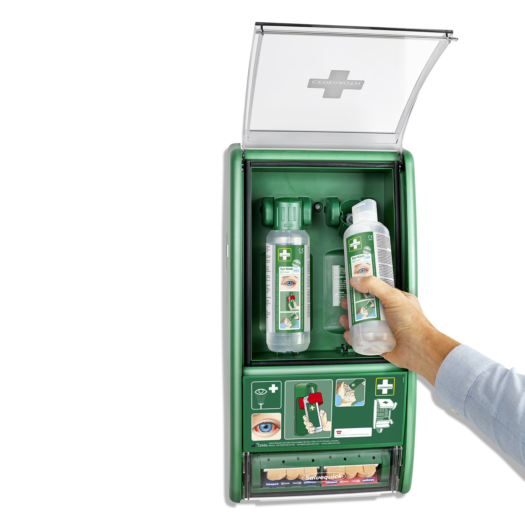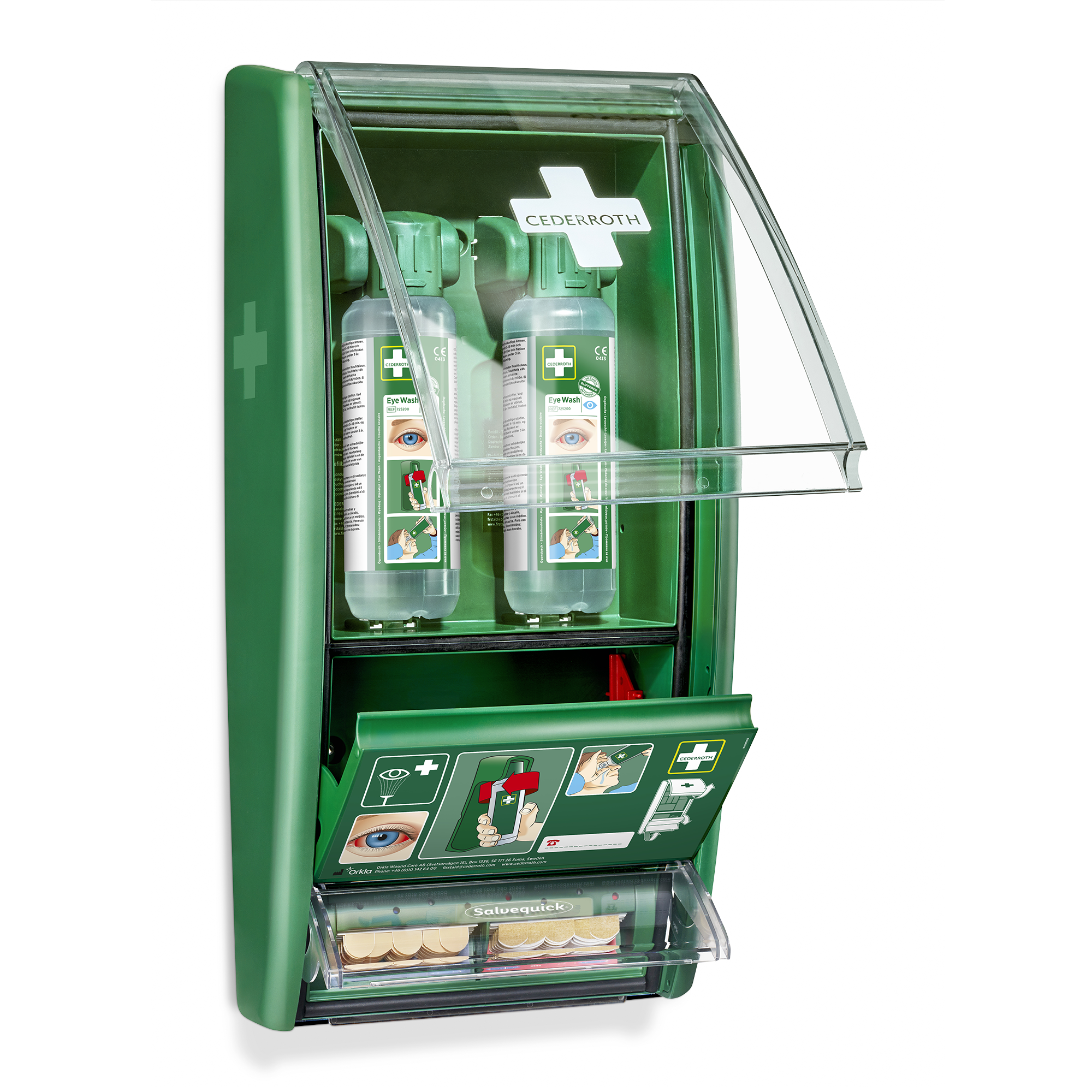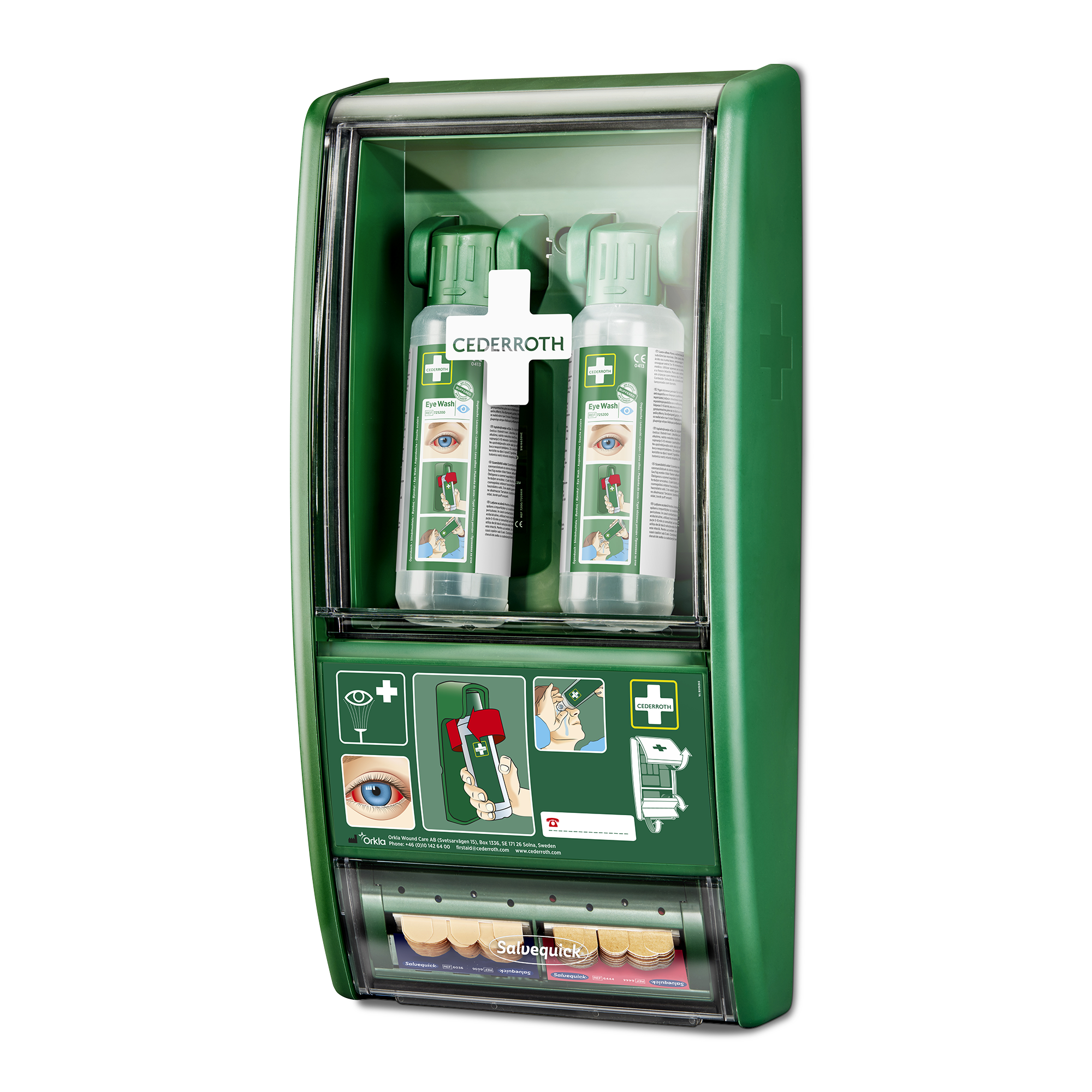 Cederroth Ögonduschstation är designad för att det ska gå fort att få hjälp. Stationen har plats för 2 flaskor som öppnas automatiskt när de vrids ur hållarna. Flaskorna är utformade så att ögat sköljs med ett rikligt flöde i cirka 1,5 minut.