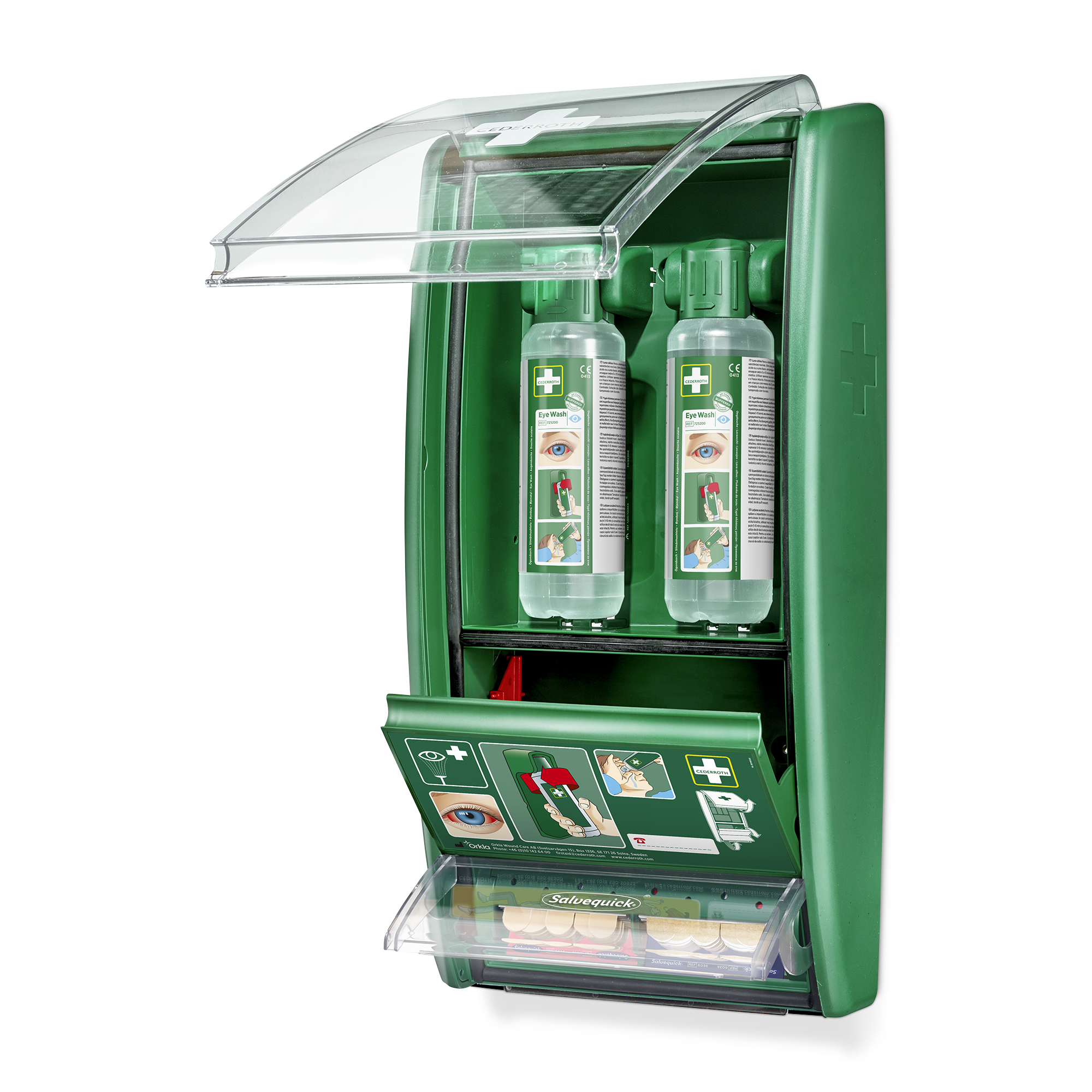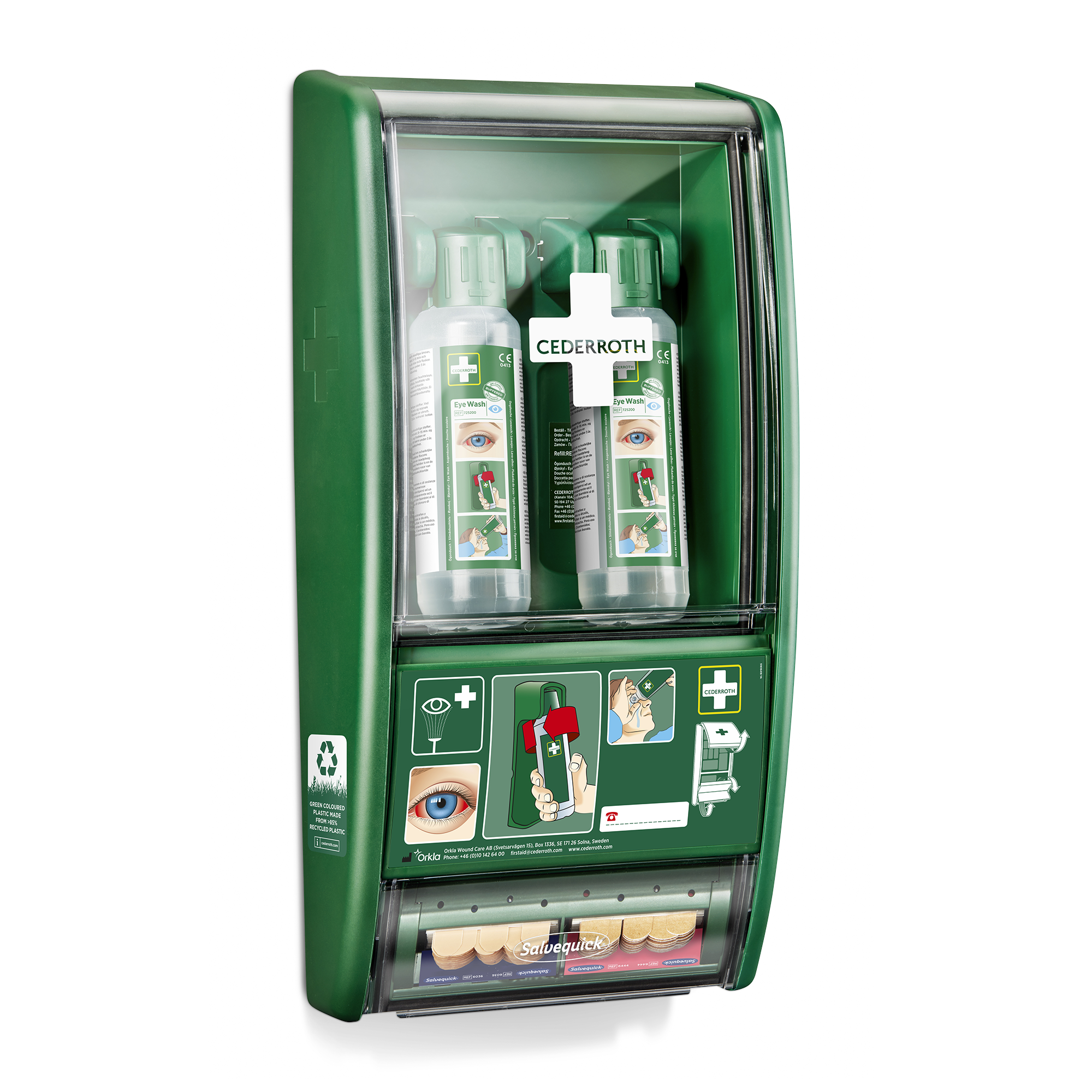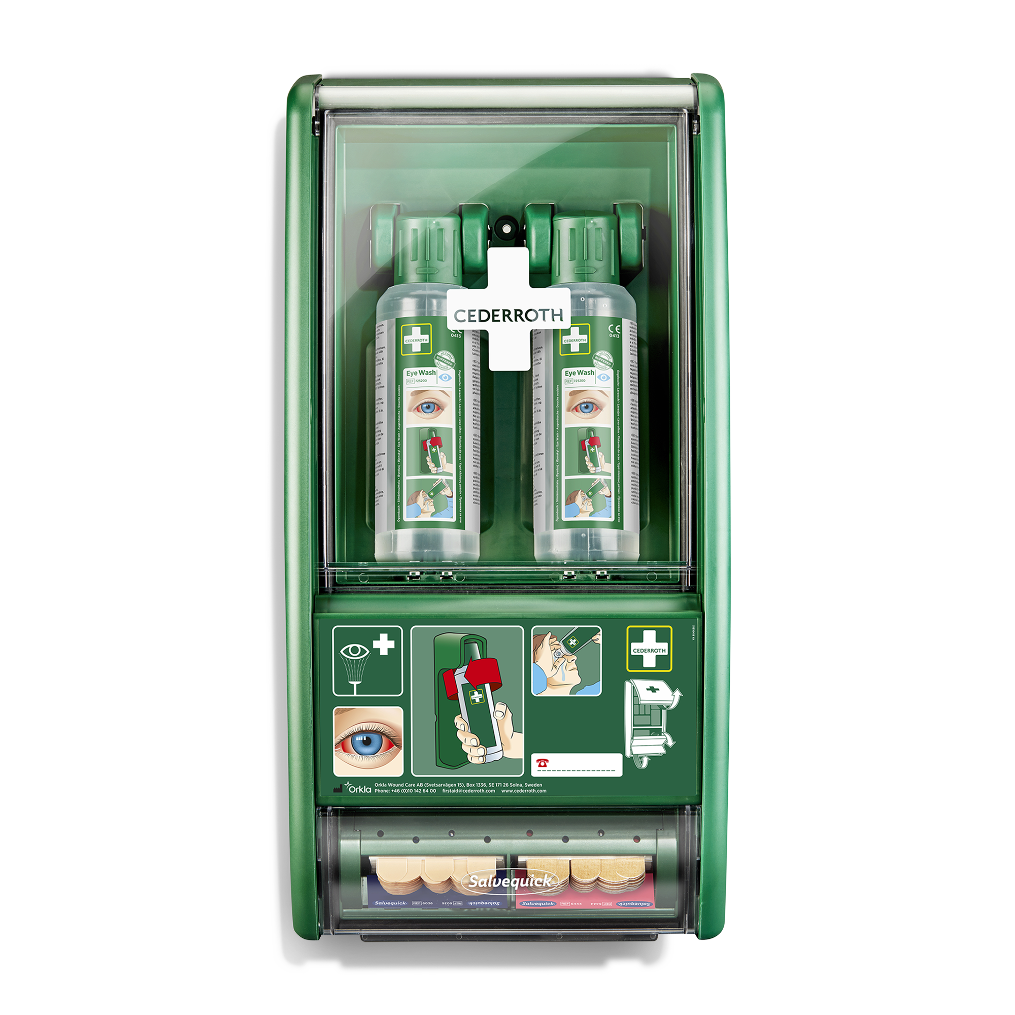 Cederroth Ögondusch – bevisat mer effektiv än koksaltlösning vid stänk från alkalier och syror. Cederroth Ögonduschstation är designad för att det ska gå fort att få hjälp. Stationen innehåller 2 flaskor som öppnas automatiskt när de vrids ur hållarna. Flaskorna är utformade så att ögat sköljs med ett rikligt flöde i cirka 1,5 minut. 4,5 års hållbarhetstid. Buffrad vätska ökar chansen att rädda ögonen. Cederroth Ögondusch verkar för att neutralisera ögats pH-värde, dvs den har en neutraliserande effekt på stänk av alkalier och syror vilket ger snabbare resultat än en vanlig koksaltlösning. Effekten är generellt starkare på alkalier än syror. Stationen är också utrustad med en Salvequick Plåsterautomat. Plåstren i vår automat dras nedåt för att undvika att man smutsar eller blöder ner övriga plåster. Plåsterrefillerna sitter fastlåsta i automaten för att säkerställa att de inte försvinner. De tomma refillerna lossas enkelt med en specialnyckel. Innehåll: 2 Cederroth Ögonduschflaskor à 500 ml. Salvequick Plåsterautomat inkl. 40 textil- och 45 plastplåster (REF 6444, REF 6036). 1 Ögonduschinstruktion. 1 Refillnyckel. Plasten i Cederroth Eye Wash Station är från sommaren 2025 tillverkad av >87% återvunnen plast.