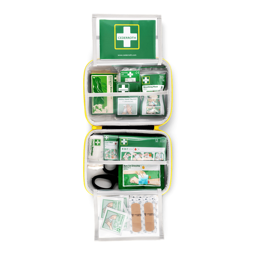Cederroth First Aid Kit Medium är ett bra komplement till väggfast utrustning för verksamheter som ofta är på språng. Väskan är lätt att bära med sig och har ett justerbart kardborrhandtag. Cederroths Första Hjälpen-kits är designade i signalfärger och är användarvänliga, de är utrustade med välbeprövade produkter som är enkelt utformade och försedda med tydliga instruktioner. Innehåll: 1 Cederroth 4-in-1 Blodstoppare (REF 1910). 1 Cederroth 4-in-1 mini Blodstoppare (REF 1911). 1 Cederroth Burn Gel Dressing (REF 901900). 10 Salvequick Plåster (REF 510005534). 4 Salvequick Big Plasters (REF 510005534). 1 Elastisk binda 8 cm x 4 m (REF 1882). 6 Salvequick Sårtvättare (REF 510005534). 1 Andningsmask (REF 2596). 2 par handskar (REF 2596). 2 Safety Hand Cleanser (REF 2596). 1 Räddningsfilt med värmereflekterande aluminiumsida (REF 1892). 1 Sax (REF 270002). 1 Första Hjälpen-instruktion. 1 Innehållsförteckning. Mått: B 231 x H 190 x D 78 mm.
