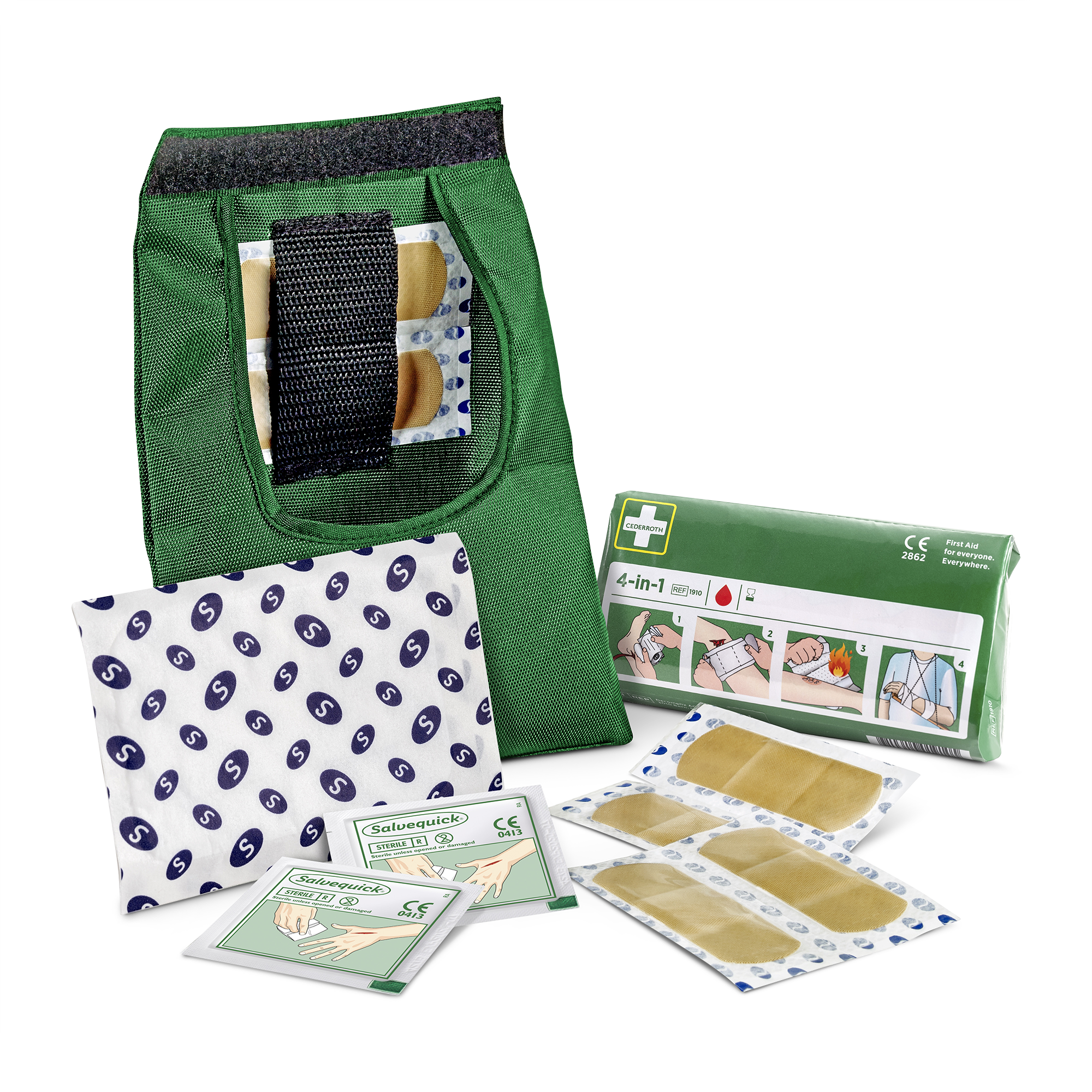 Smidigt Första Hjälpen-kit i fickformat som är lätt att bära med sig. Fodral i nylon med bälteshällor och kardborrestängning. För en person, innehåller blodstoppare, sårtvätt och plåster