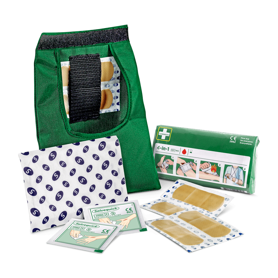 Smidigt Första Hjälpen-kit i fickformat som är lätt att bära med sig. Fodral i nylon med bälteshällor och kardborrestängning. För en person, innehåller blodstoppare, sårtvätt och plåster