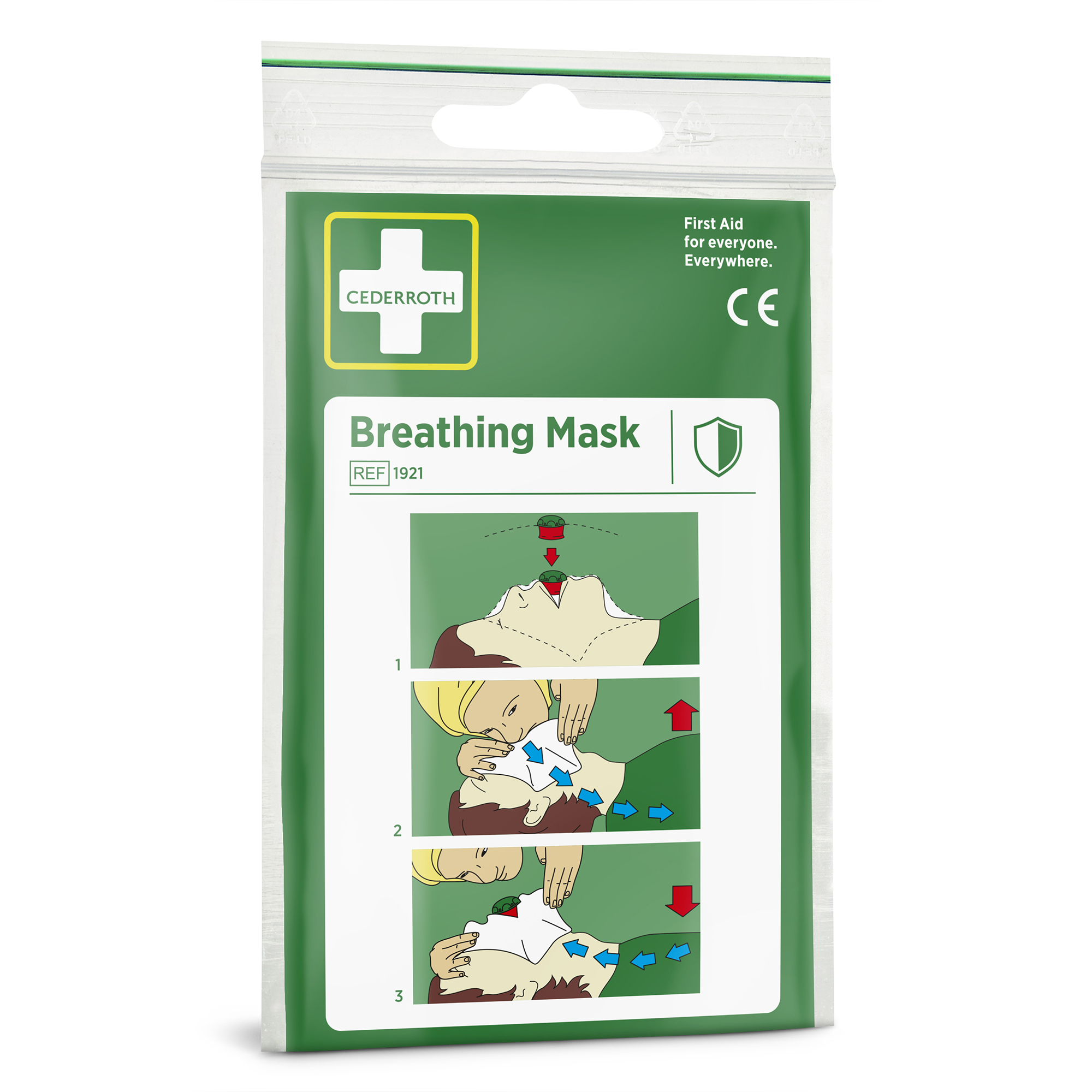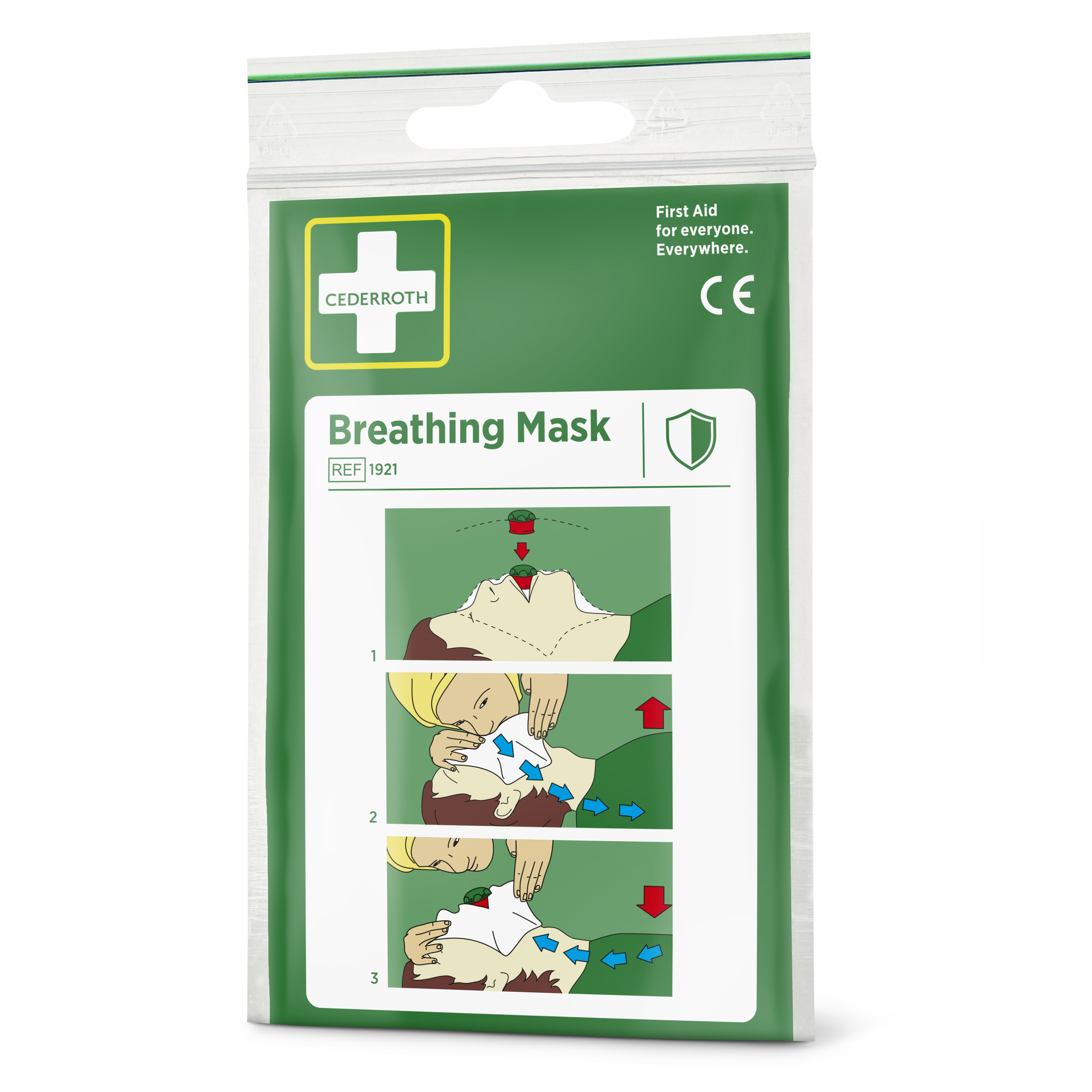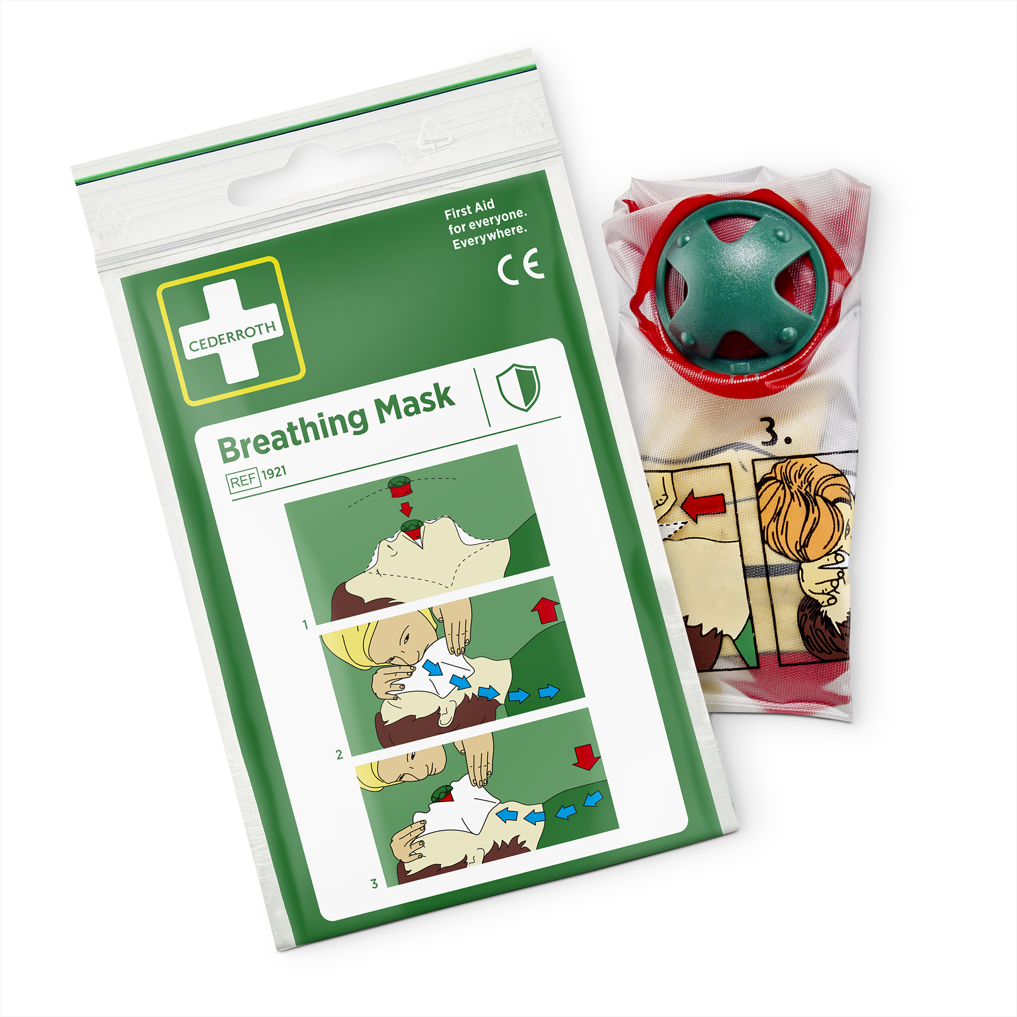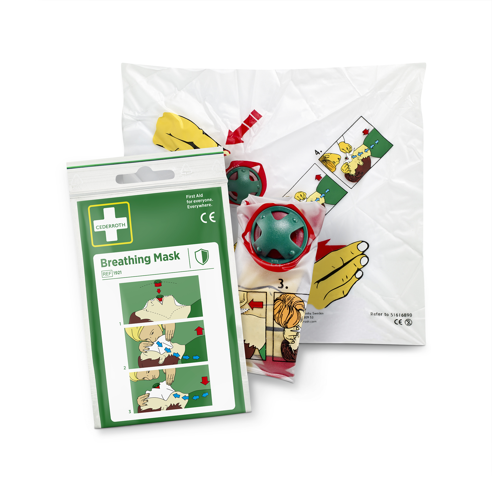 Cederroth Andningsmask är ett hjälpmedel för att ge mun-till-mun-andning på rätt sätt samtidigt som det minskar risken för kontakt mellan hjälpare och skadad. Andningsmasken består av en plastduk med backventil. Tydliga instruktioner är tryckta direkt på duken.