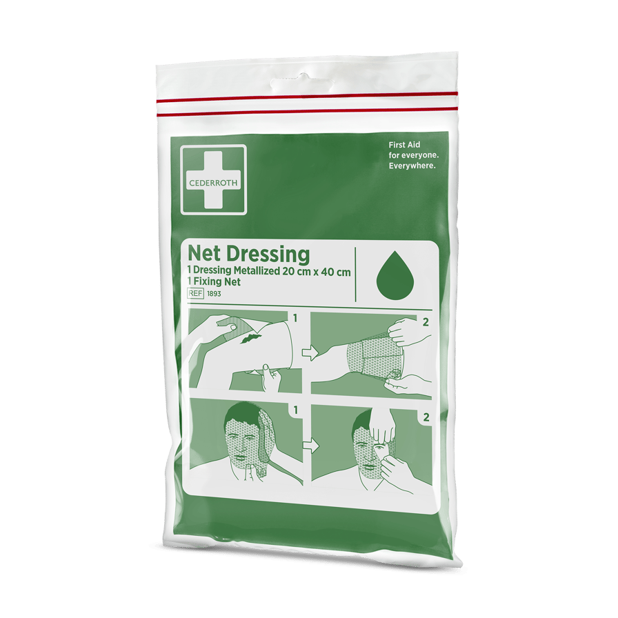 Metalliserad kompress 20x40 cm med fästnät avsedd för skador på huvudet, lämpligt även för att lägga förband på armar och ben.