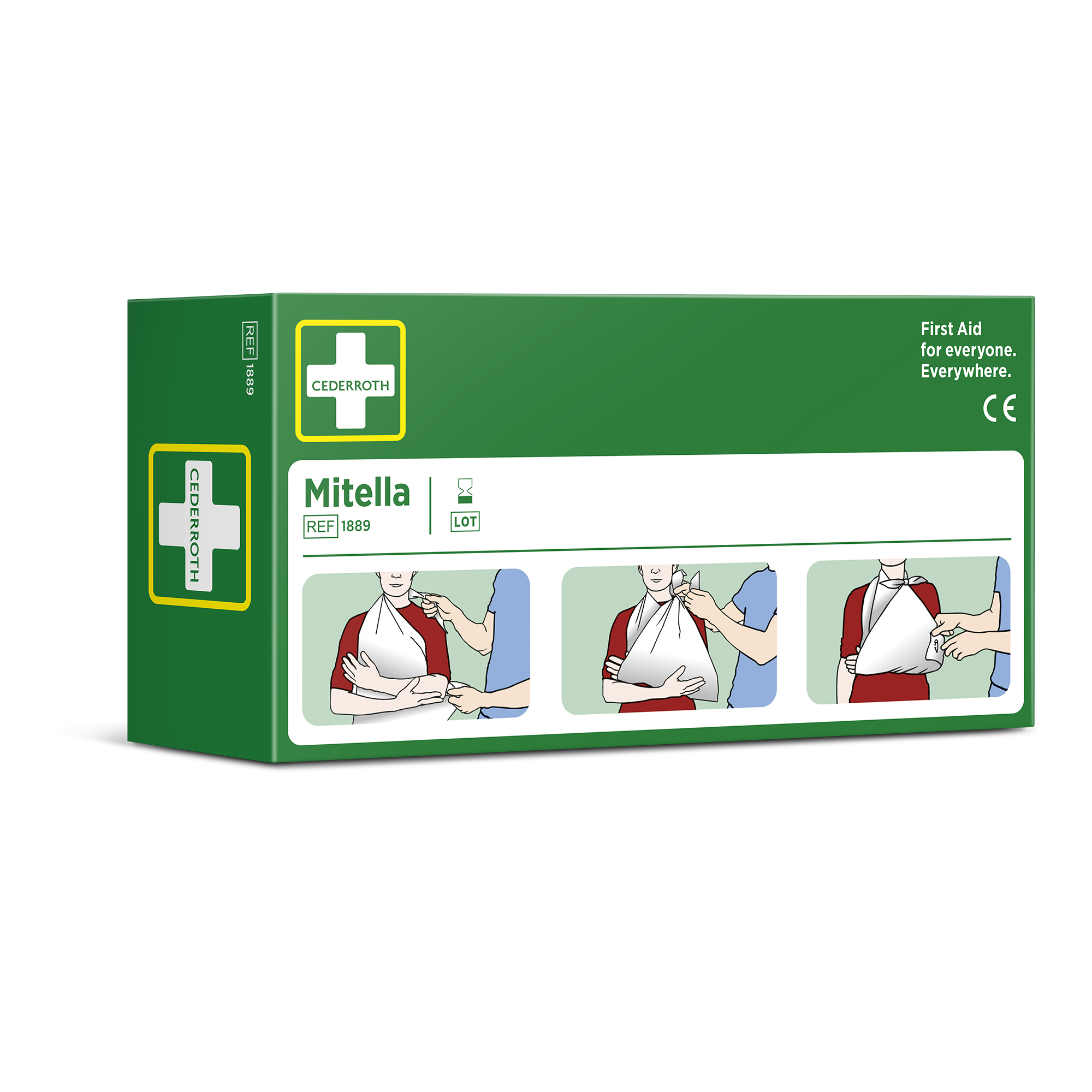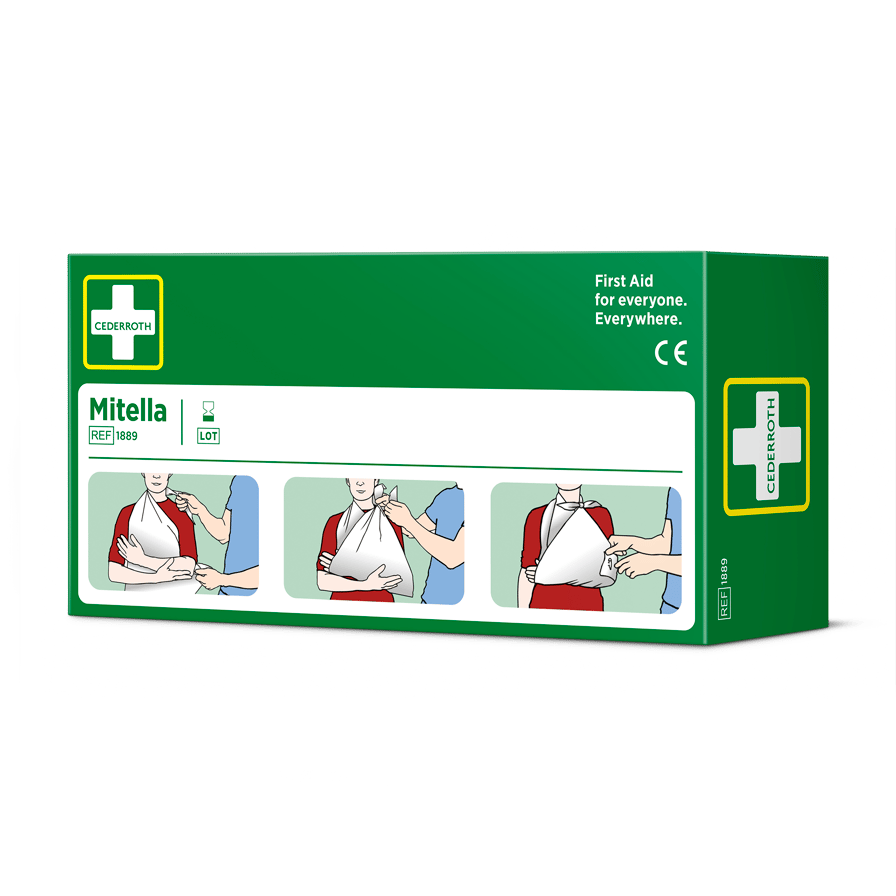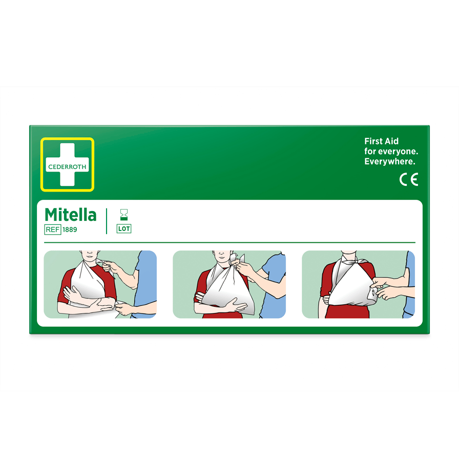 Cederroth Mitella knyts om halsen för stöd av en skadad arm. Kan också lindas runt huvudet för att hålla en kompress på plats vid huvudskada.