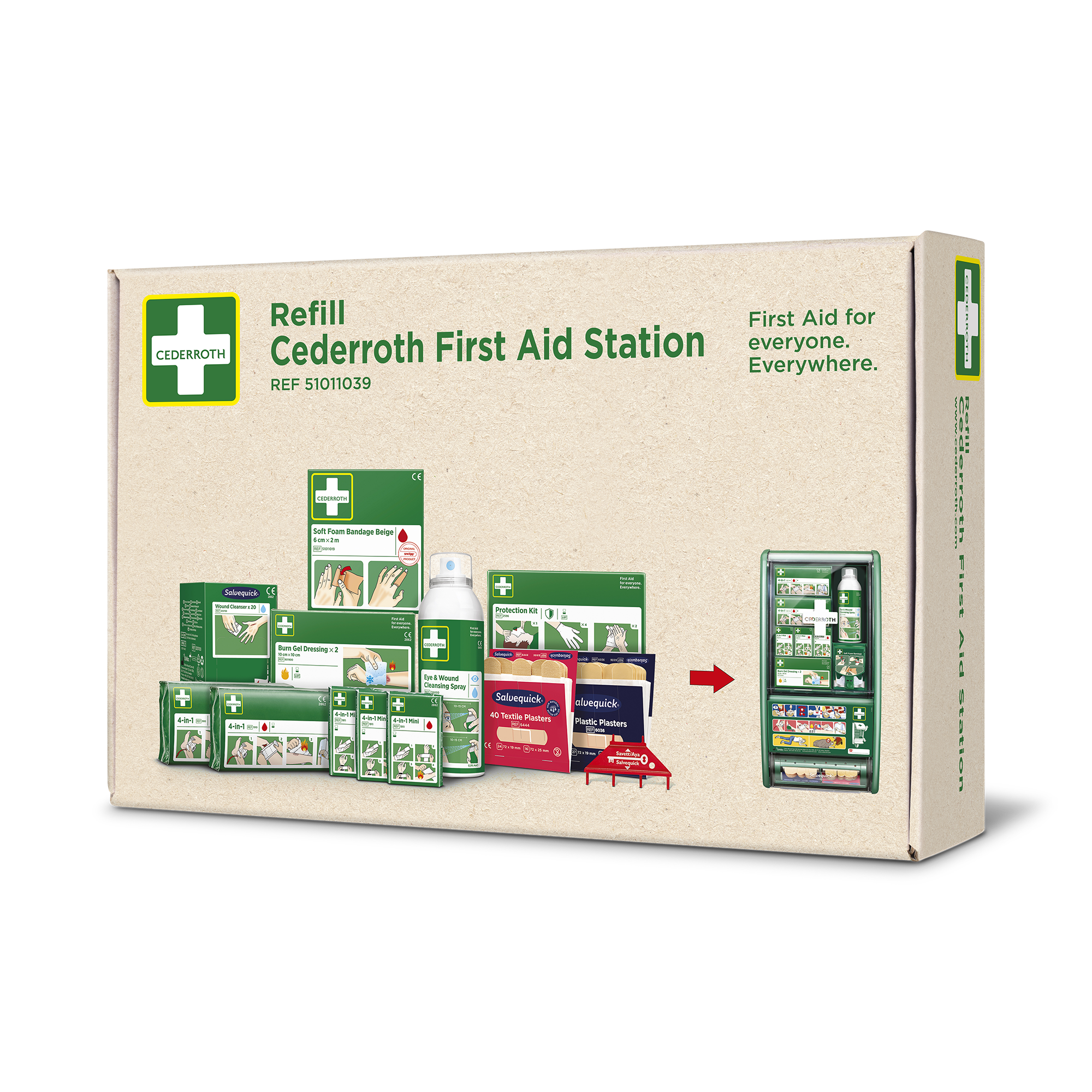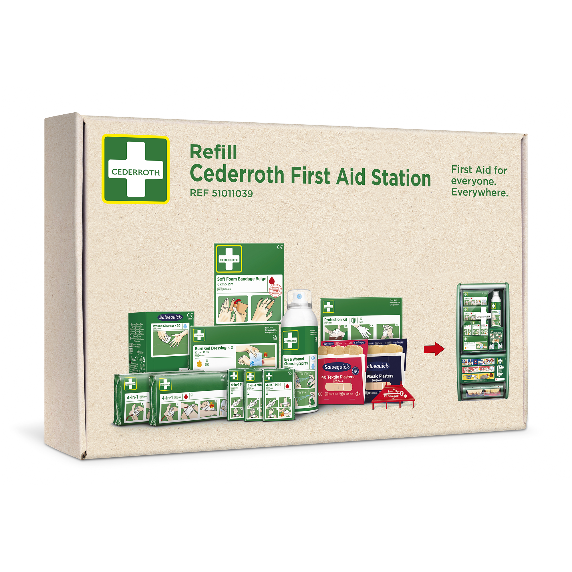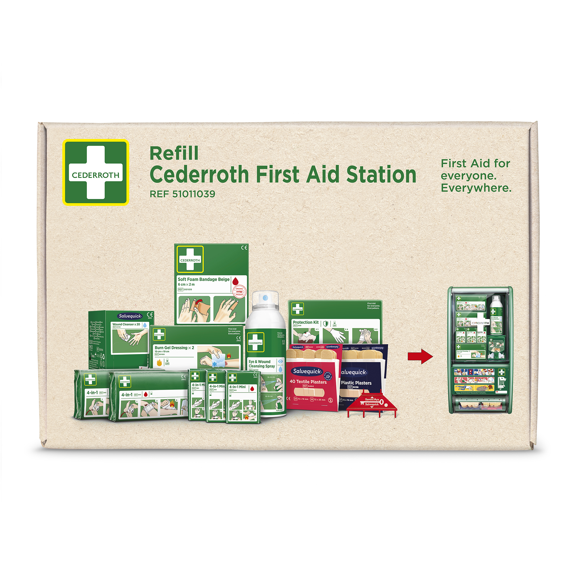 Cederroth Refillpaket till Första Hjälpen Station (REF 51011026) innehåller en komplett uppsättning refiller till stationen. Innehåll: 2 x Cederroth 4-in-1 Blodstoppare (REF 1910). 3 x Cederroth 4-in-1 mini Blodstoppare (REF 1911). 1 x Cederroth Skyddspaket (REF 2596). 1 x refill (45) Salvequick Plastplåster (REF 6036). 1 x refill (40) Salvequick Textilplåster (REF 6444). 1 x box (20) Salvequick Sårtvättare (REF 323700). 1 x Eye & Wound Cleansing Spray (REF 726000). 1 x box (2) Cederroth Burn Gel Kompress (REF 901900). 1 x Cederroth Soft Foam Bandage Beige 6 cm x 2 m (REF 51011019). 1 x Refillnyckel.