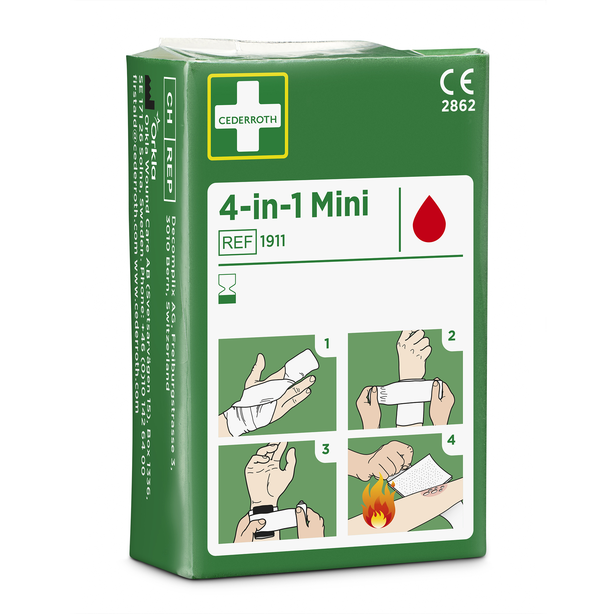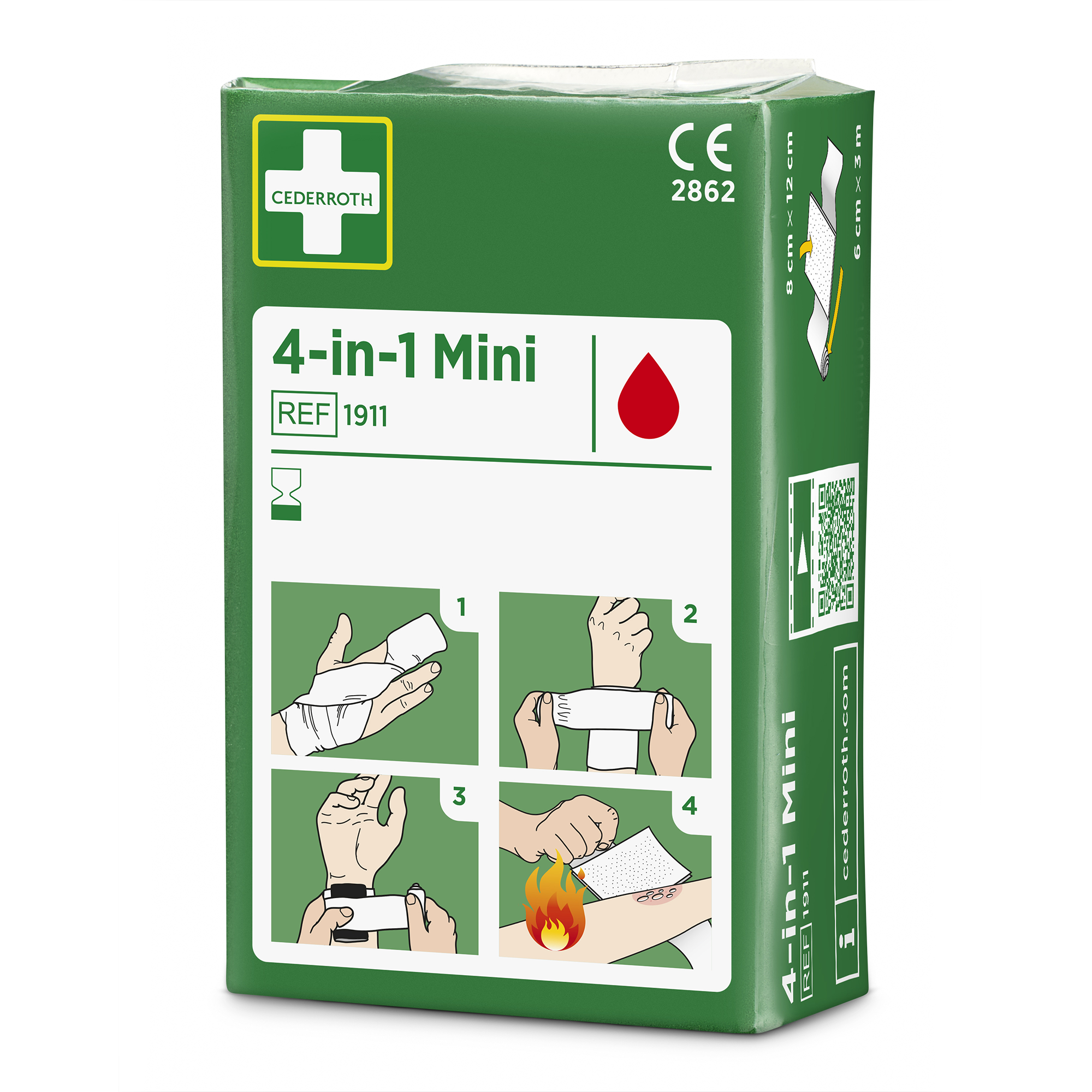 Cederroth 4-in-1 Blodstoppare är ett litet smidigt sterilt första förband speciellt lämpligt för skador på fingrar och tår. Innehåll: 1 st kompress (8 x 12 cm). 1 st elastisk binda (6 cm x 3 m). Tydliga färgbilder och instruktioner är tryckta direkt på förpackningen.