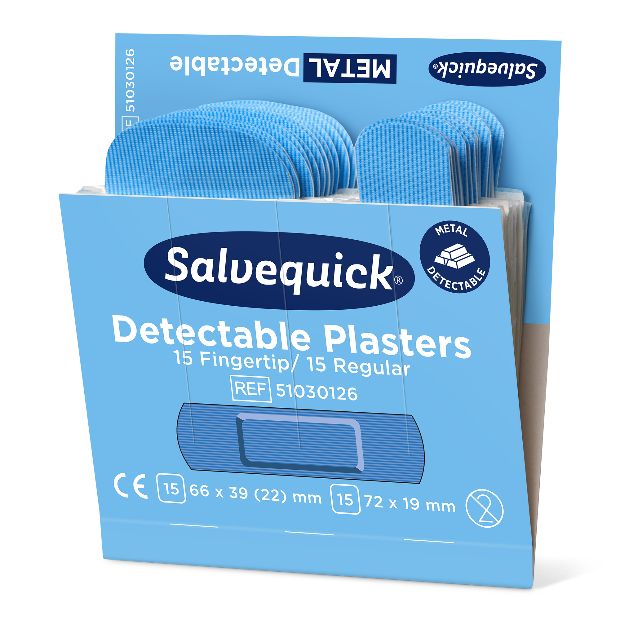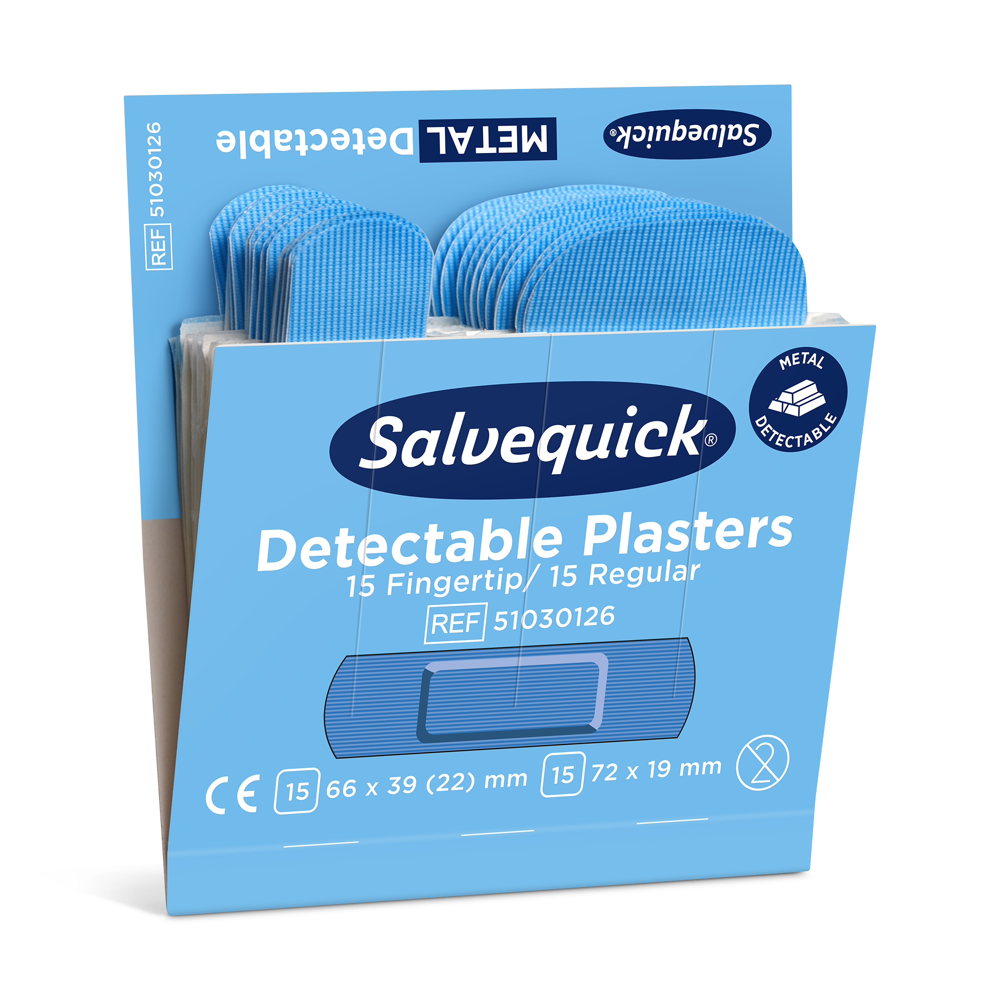 Salvequick Blue Detectable plåster Fingertip/Regular är särskilt avsedda för användning inom livsmedelsindustrin. De är lätta att applicera, flexibla och smidiga att använda. Allergivänliga plåster. Salvequick Blue Detectable refill passar i Salvequick Plåsterautomat och Wound Care Dispenser.